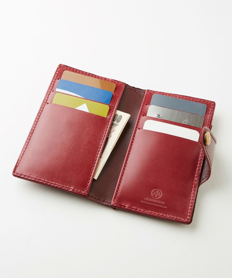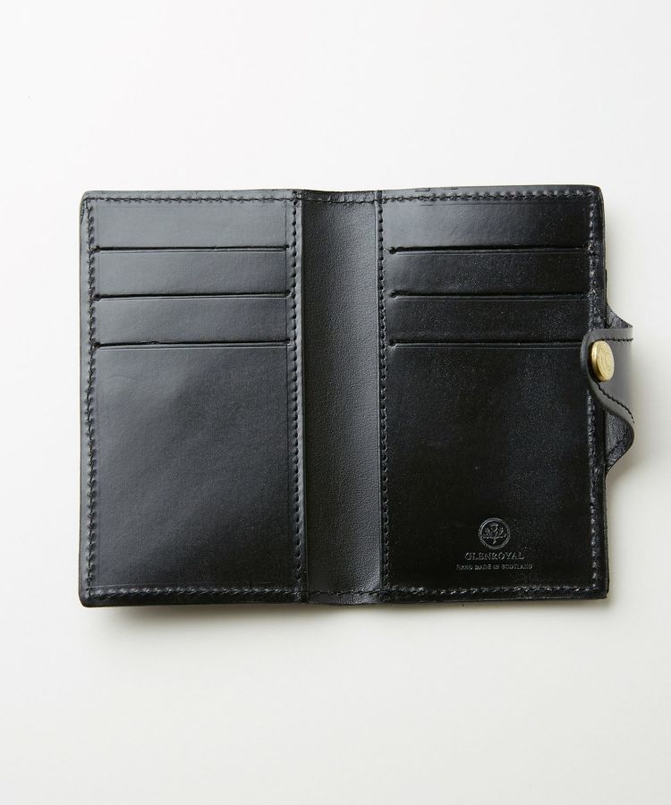 カードポケットは全部で9つあり、クレジットカードやポイントカードなどを収納できるポケットが6つ、見開きの両サイドには大きめのポケットが2つ付き、お札類を整理して収めることが出来ます。また、裏面にはPASMOやSUICAなどのICカードも収納できるポケットが1つ付属しており、使い勝手を考慮したグレンロイヤルらしい心遣いが伺えます。ジャケットやスーツの内側に収めていただけ、小ぶりのバッグにも収まるサイズ感です。