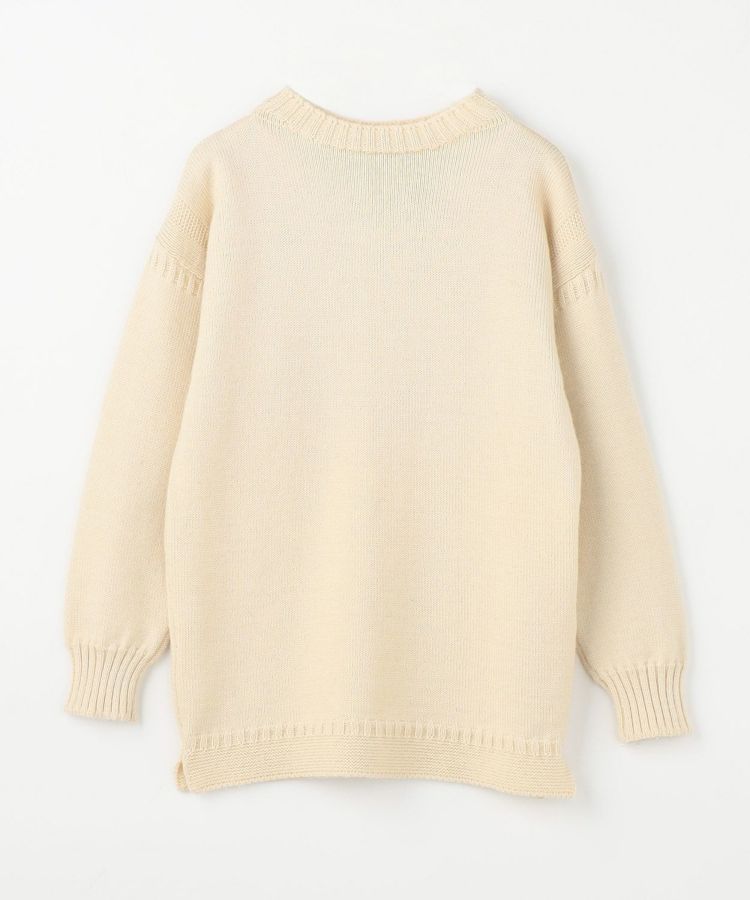 ウールで編まれたニットは肌触りがよく、漁師達が着ていただけあり、機能性と耐久性も備えています。アームホールや裾に編まれている独特の模様には、船のはしごやロープ、波などそれぞれ意味が込められています。また裾に取られたサイドスリットは運動量を上げるための仕様。襟ぐりの三角マチも同様に身体の動きを妨げない工夫がされています。袖リブと同じ、2目ゴム編みとガーター編みの二部構造は海で働く人たちのために工夫された背景のあるセーターです。