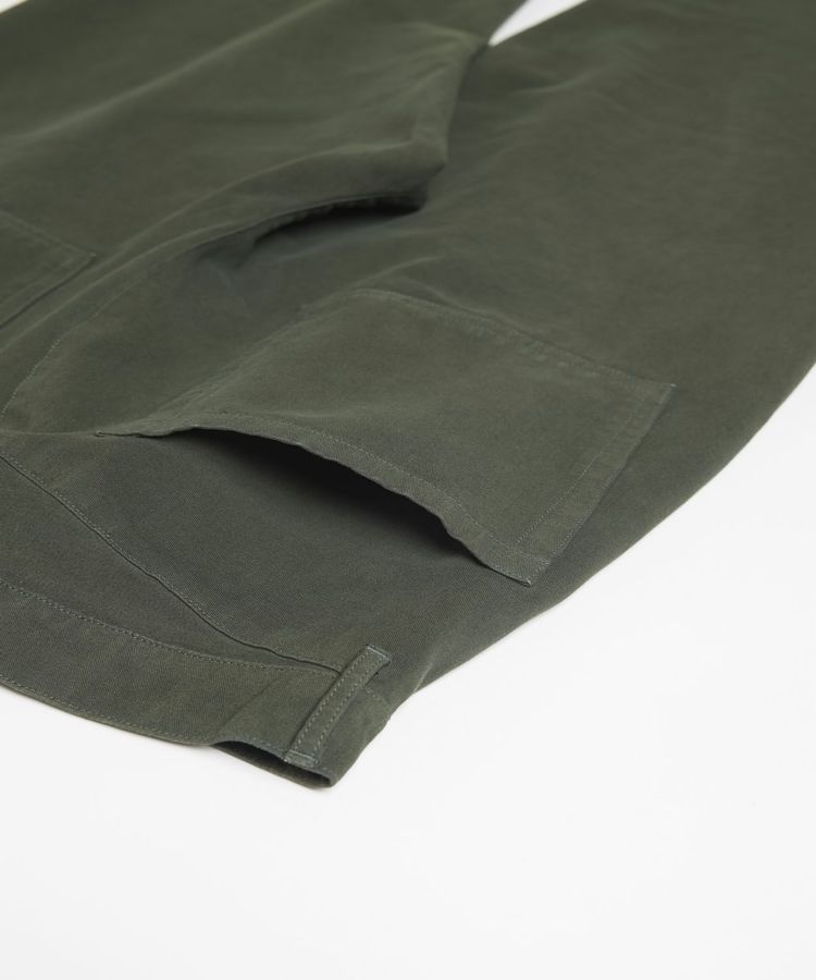生地は60番双糸に追撚をかけて高密度で織り上げたドライタッチな生地を採用。さらに製品染めをかけることで、表面に独特なしっとりした微起毛感があり、ヴィンテージのような味わいある生地感に仕上がっています。着用を繰り返すと自分の体に馴染みながら、くたっとしたカジュアルな経年変化が楽しめるアイテムです。