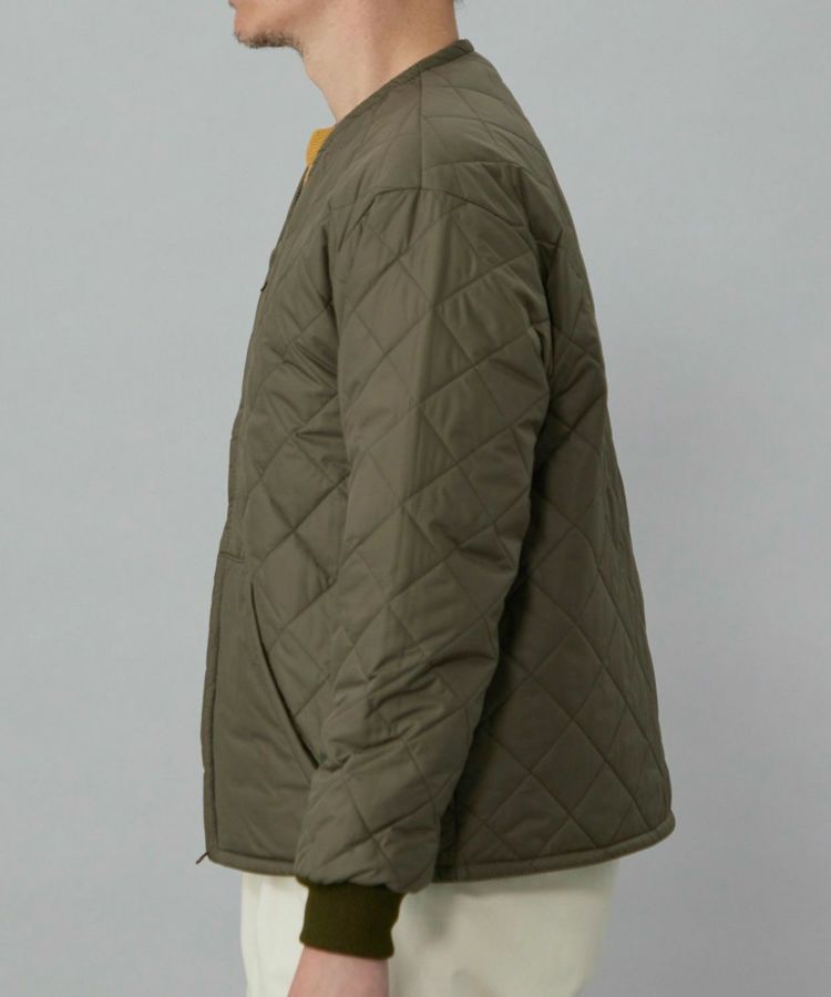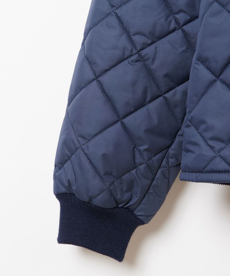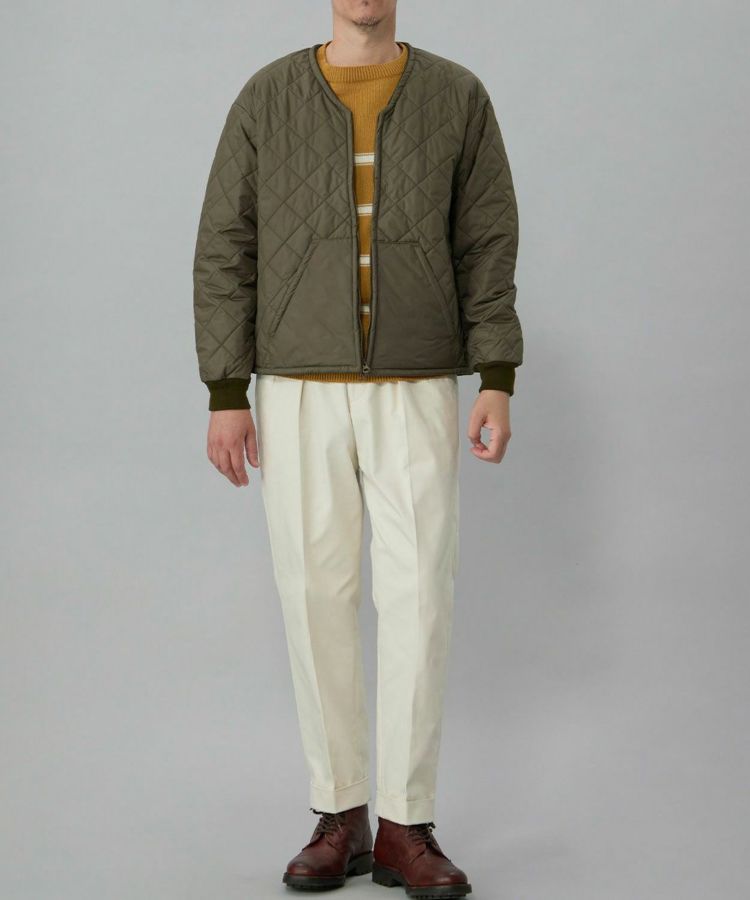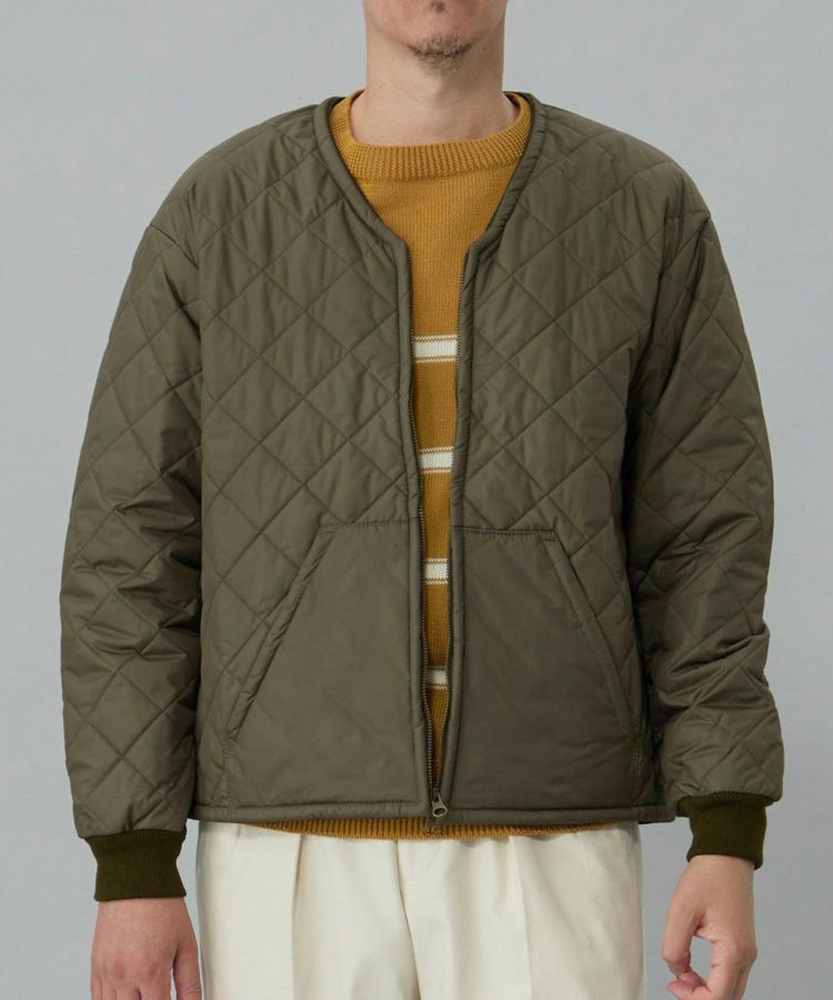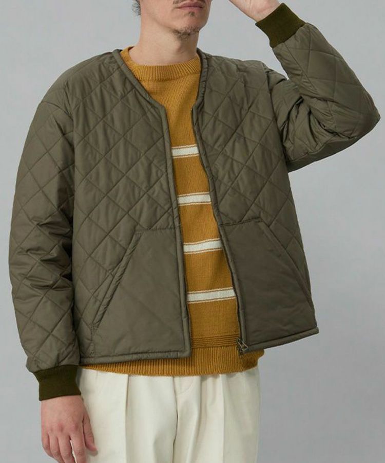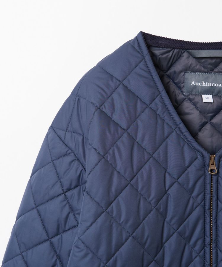 首元をすっきり見せてくれるノーカラーのショート丈キルティングブルゾン。