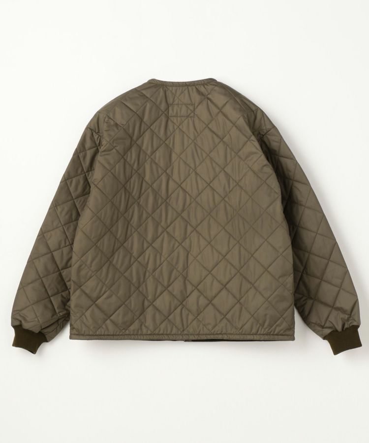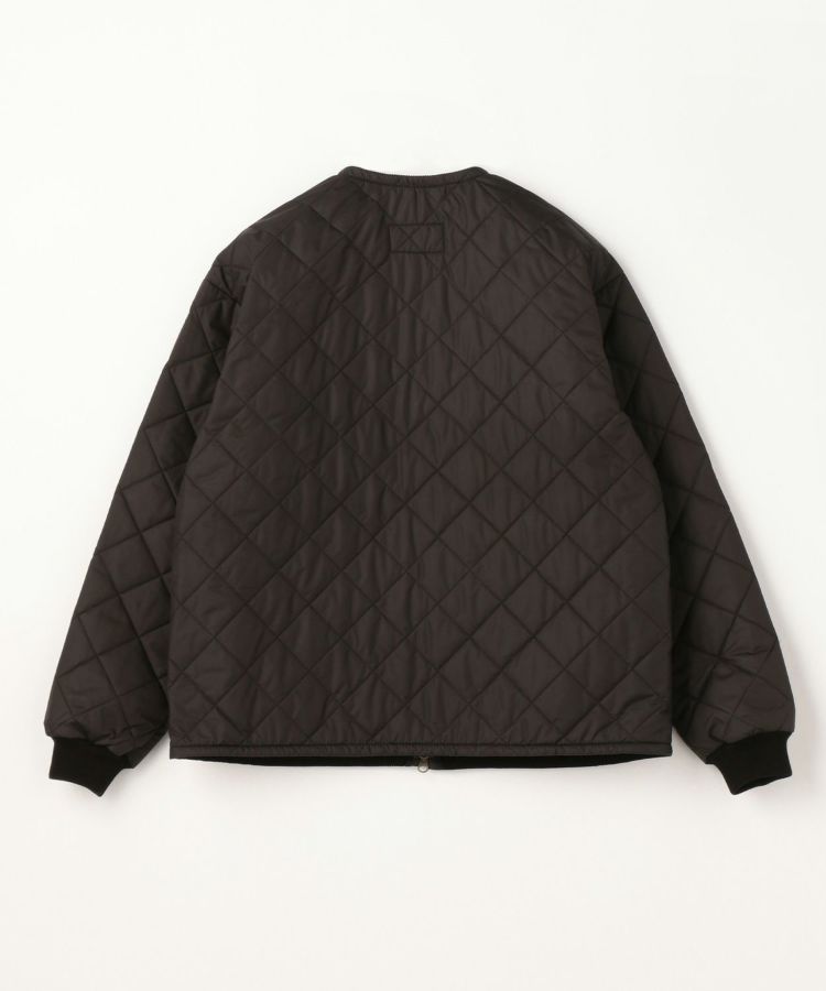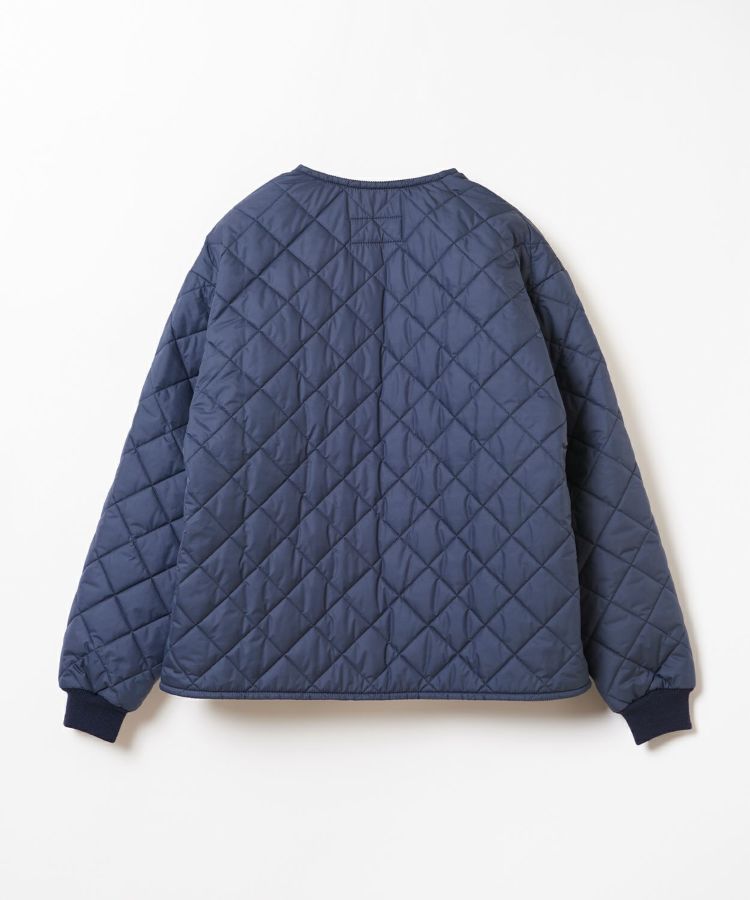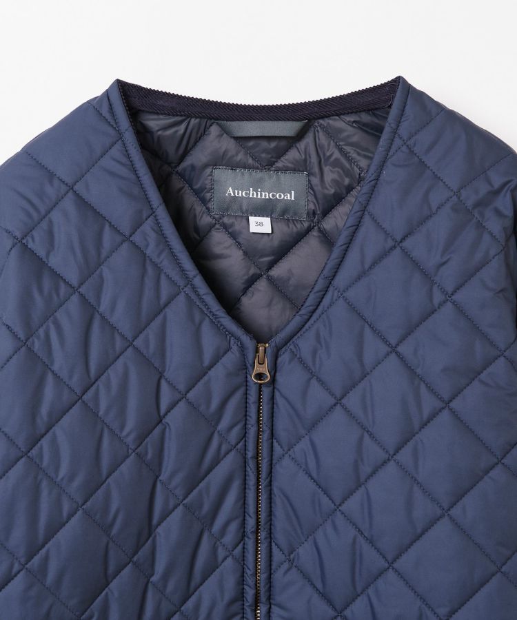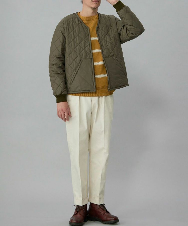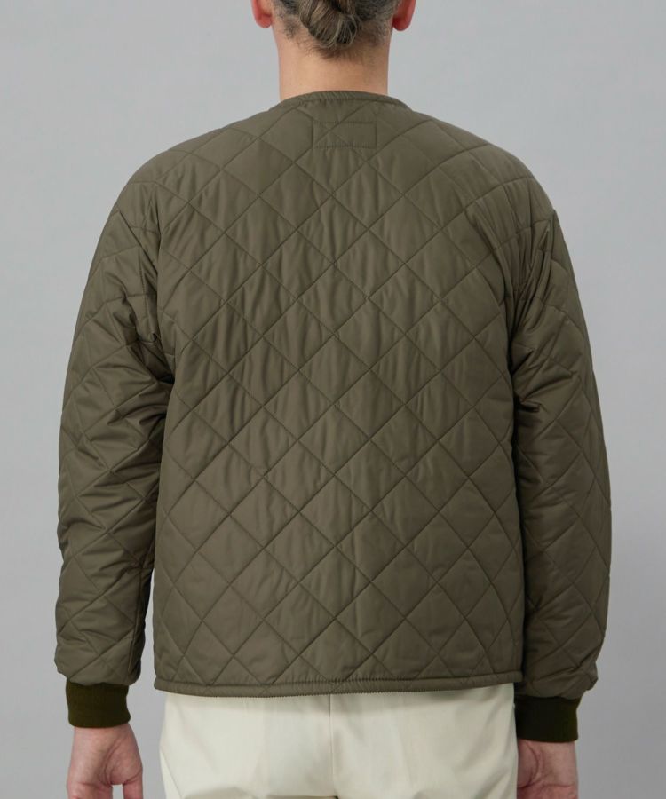 首元をすっきり見せてくれるノーカラーのショート丈キルティングブルゾン。
