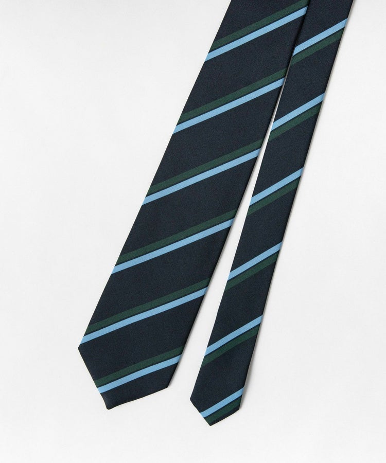 レジメンタルストライプの発祥の地はイギリス。元々、英国軍はたくさんの連隊を持っており、それぞれ連隊の所属を識別するために持っていたものが軍旗でした。軍旗には斜め縞を配したストライプを施しており、その柄で連隊を認識する事ができました。このストライプこそがレジメンタルストライプ。連隊を意味する”レジメント(Regiment)”に由来するこの”レジメンタルストライプ”を採用したネクタイは後に市場にも広がり、現在ではファッションとして多くの人に根強い支持を受けるネクタイの定番パターンとなりました。