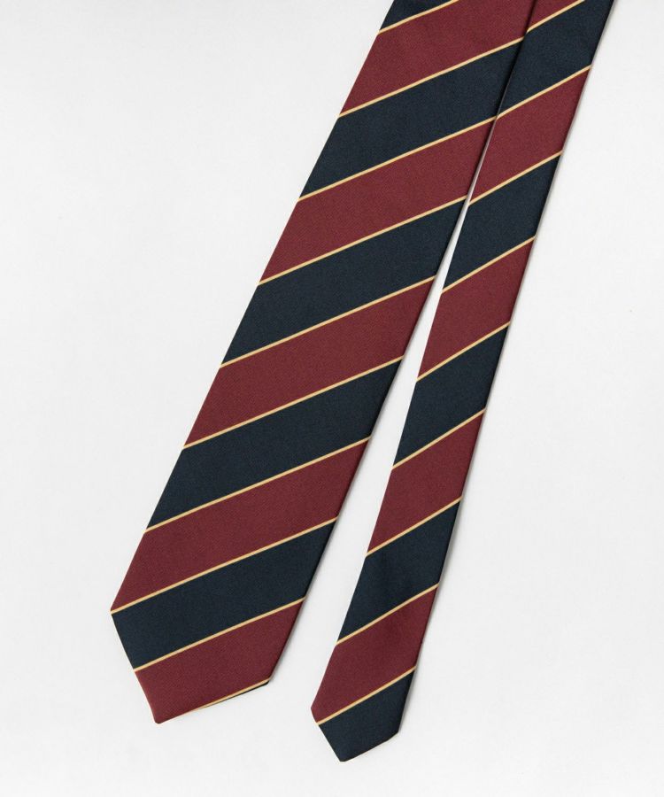 レジメンタルストライプの発祥の地はイギリス。元々、英国軍はたくさんの連隊を持っており、それぞれ連隊の所属を識別するために持っていたものが軍旗でした。軍旗には斜め縞を配したストライプを施しており、その柄で連隊を認識する事ができました。このストライプこそがレジメンタルストライプ。連隊を意味する”レジメント(Regiment)”に由来するこの”レジメンタルストライプ”を採用したネクタイは後に市場にも広がり、現在ではファッションとして多くの人に根強い支持を受けるネクタイの定番パターンとなりました。