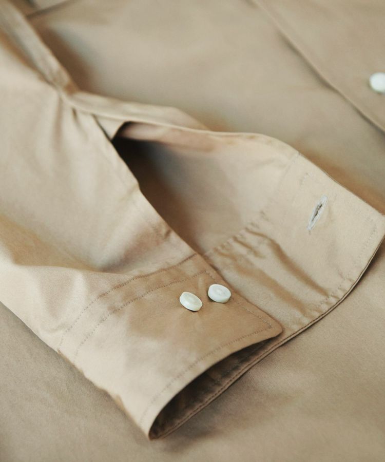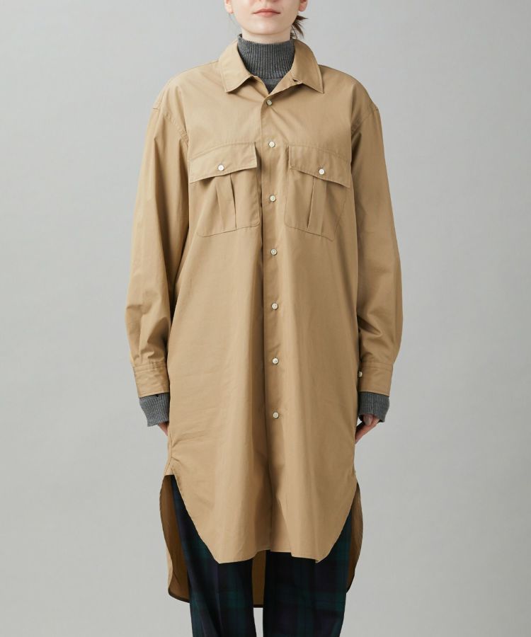 年代によってディテールが異なるイギリスのポリスオフィサーシャツですが、特に人気があり希少価値が高いといわれているのが1960年代のもの。当時は、生地にサックスブルーの刷毛目(はけめ)が使われ、襟はバンドカラー、プルオーバータイプのシャツでした。この原型をもとに、メンズらしさは残しつつも、丈とアームホールのパターンを調整することで女性らしくも着ることができるシャツワンピースが完成しました。生地にはシルキーな肌触りの超長綿を採用し、丁寧なステッチワークを得意とする国内工場で生産するなど、細部にまでこだわった上質な一着です。