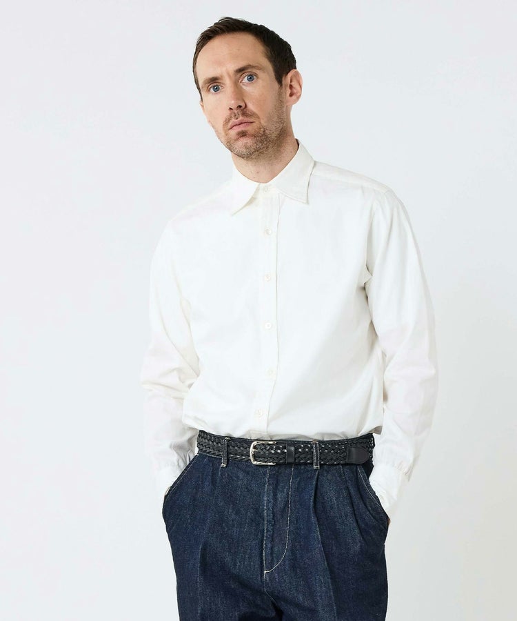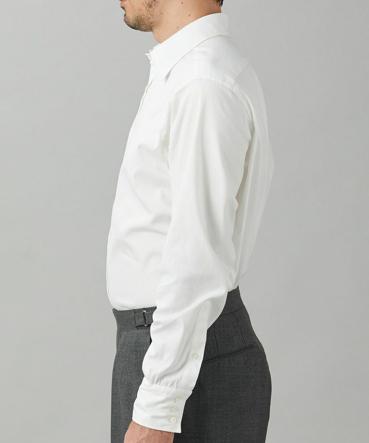 今回、新たに加わるのはオックスフォード生地の一種である「ピンポイントオックス」(通称ピンオックス)を使用したホワイトの1着。通常のオックスフォードよりも細番手のコットンを使って織られているため、シルクのような肌ざわりと光沢感があります。適度なハリ感や通気性を備えており、一年を通して使いやすいのが特徴です。