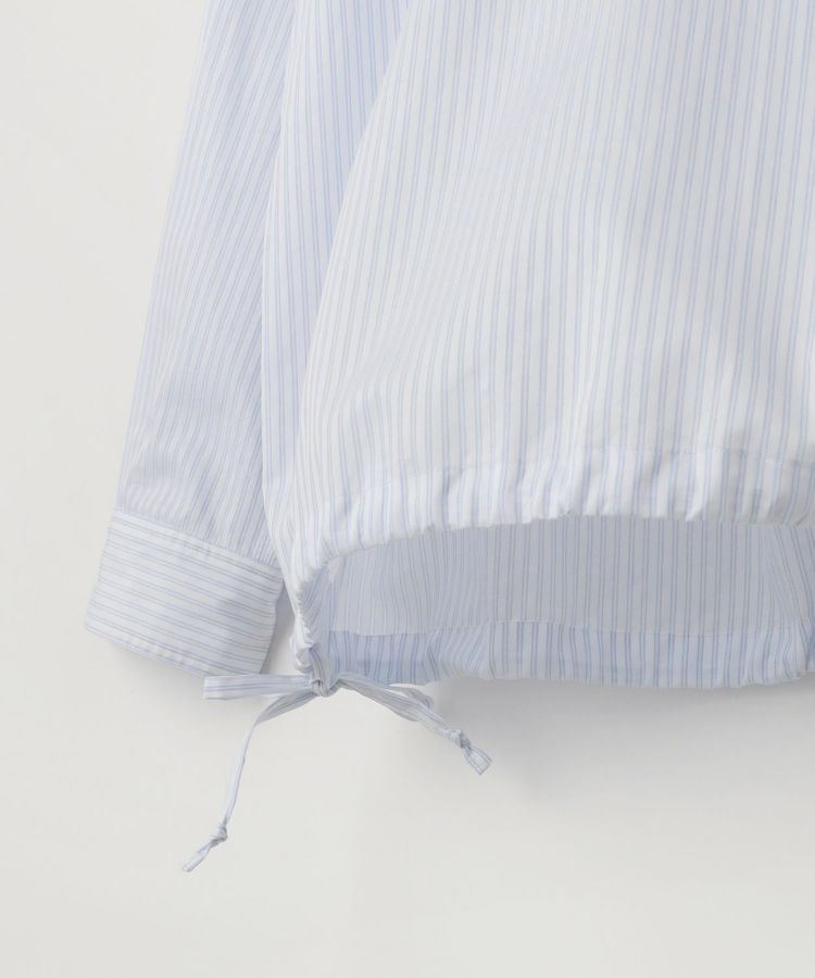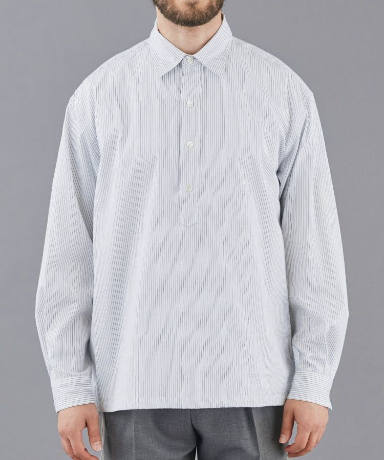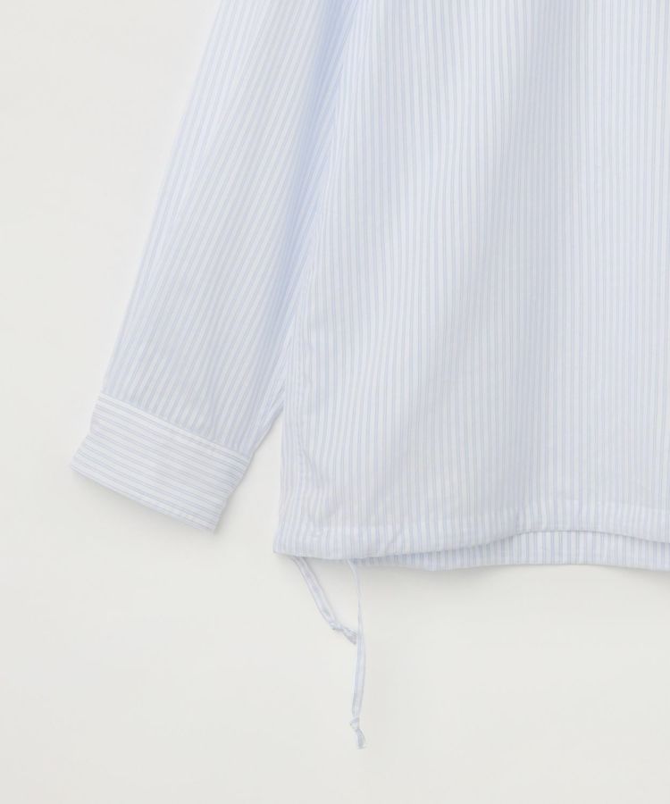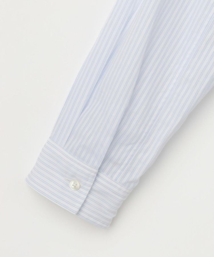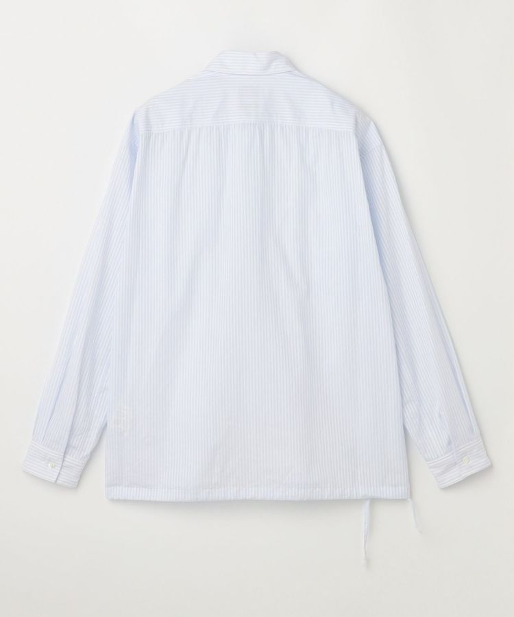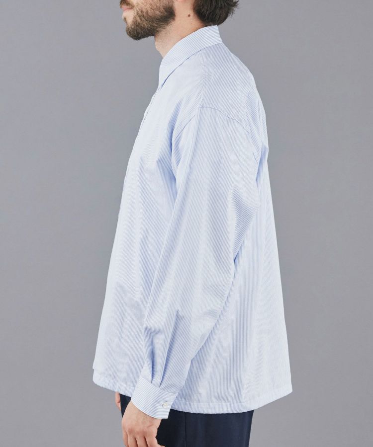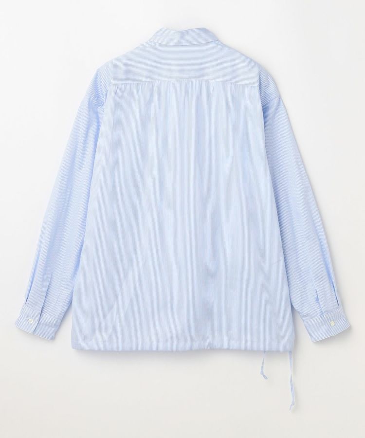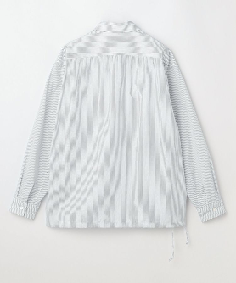 イタリアのカプリシャツのイギリス版をイメージし、カジュアルシーンで夏にサラッとラフに羽織れて大人らしい品のあるシャツを開発。襟のインカーブや柔らかい芯地のレギュラーカラーなどドレスシャツ/ロンドンとも通じる仕様。生地とカフスがある点はシャツ要素ですが、共地の紐を使い裾がブラウジングでき、タックアウトした時はブルゾンのようなシルエットに。またタックインのバランスを考慮した作りになっておりTPOに併せた装いが可能です。