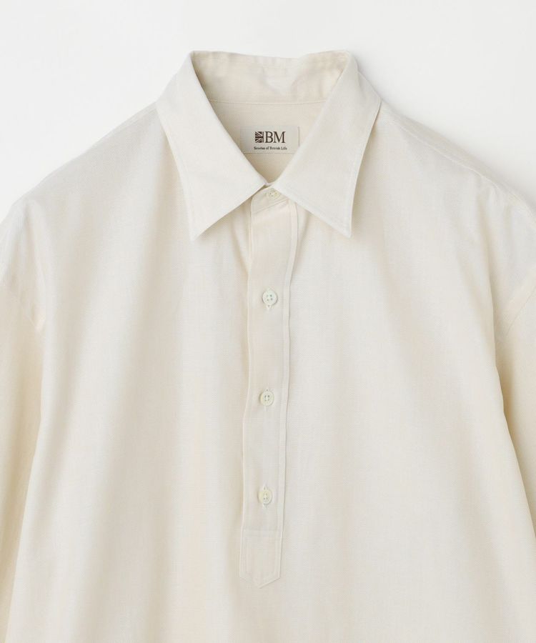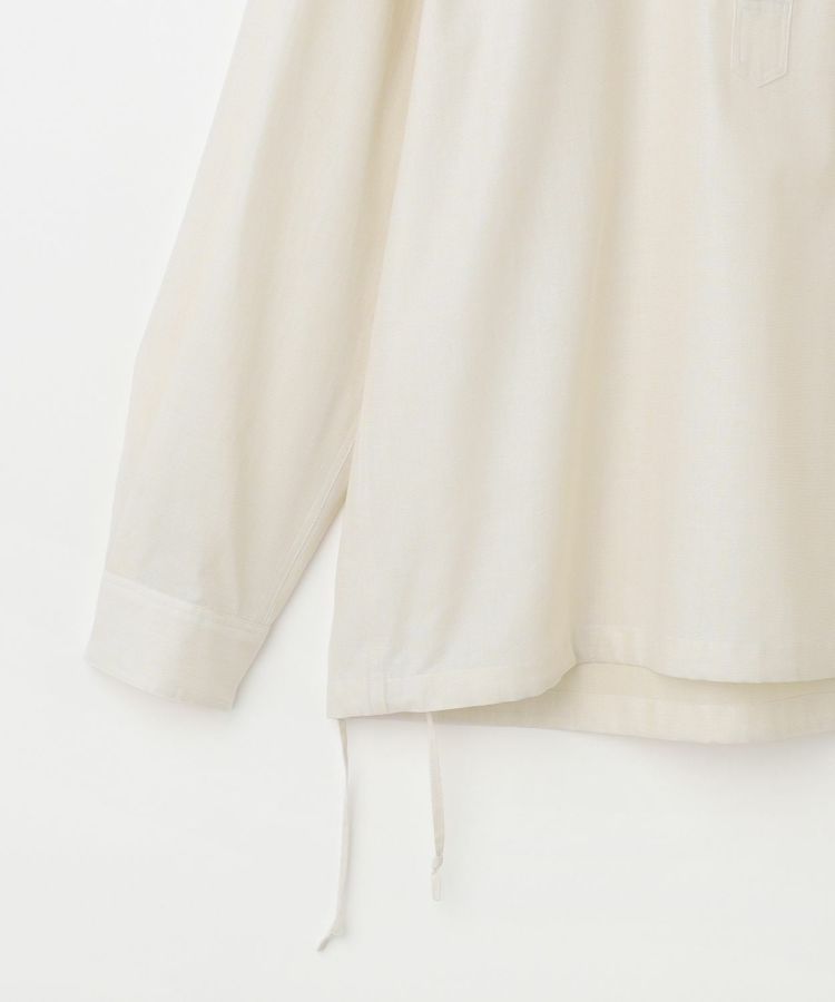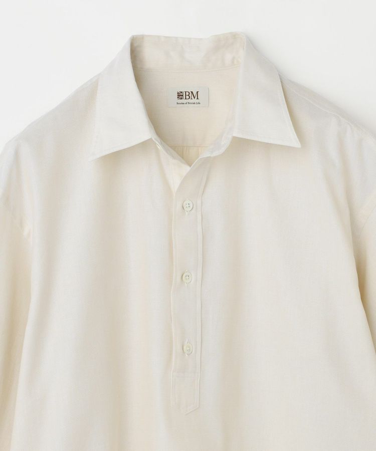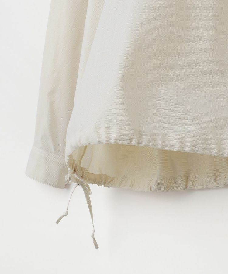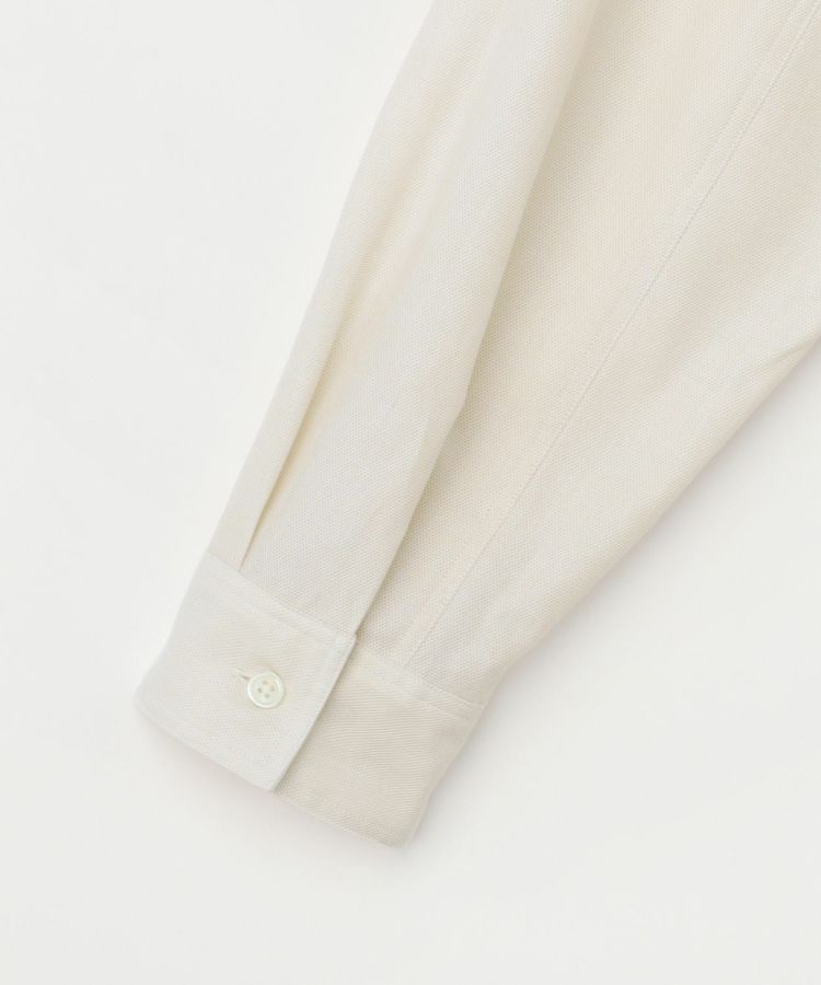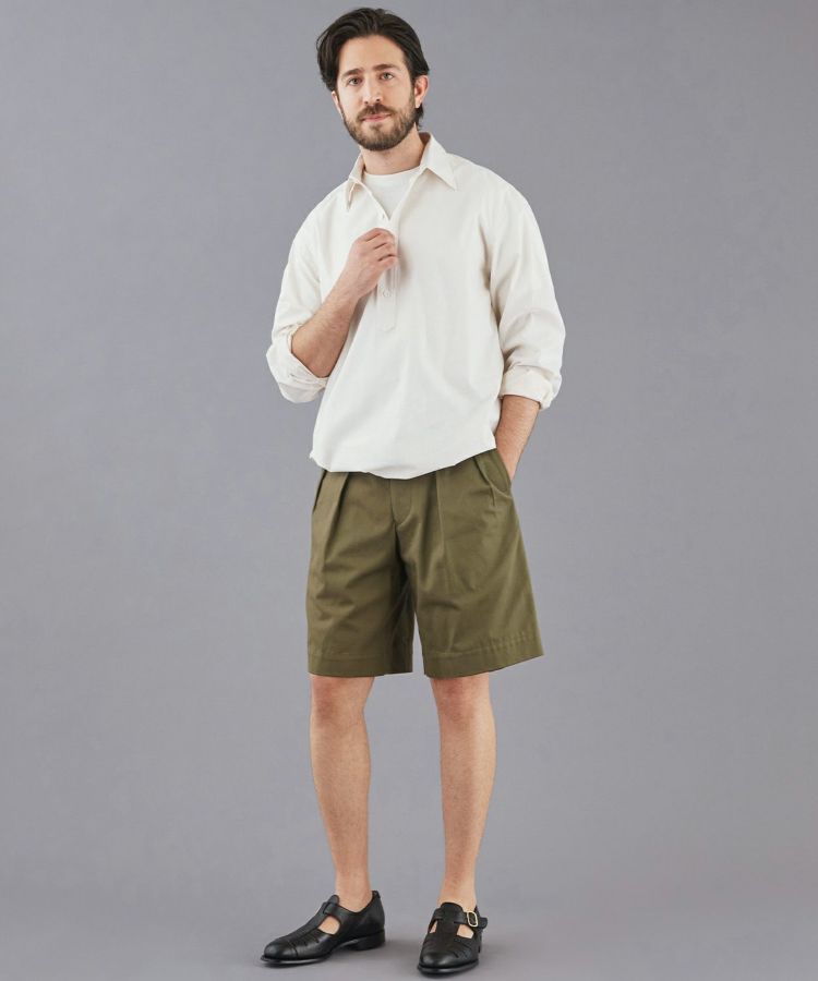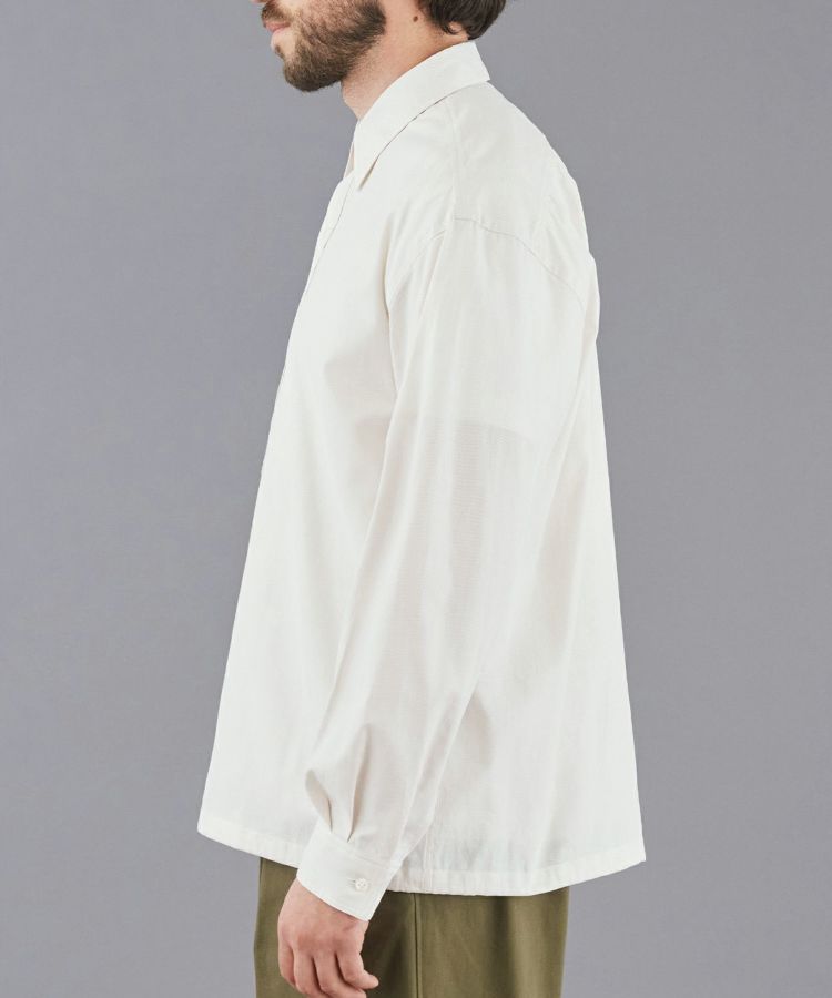 イタリアのカプリシャツのイギリス版をイメージし、カジュアルシーンで夏にサラッとラフに羽織れて大人らしい品のあるシャツを開発。襟のインカーブや柔らかい芯地のレギュラーカラーなどドレスシャツ/ロンドンとも通じる仕様。生地とカフスがある点はシャツ要素ですが、共地の紐を使い裾がブラウジングでき、タックアウトした時はブルゾンのようなシルエットに。またタックインのバランスを考慮した作りになっておりTPOに併せた装いが可能です。