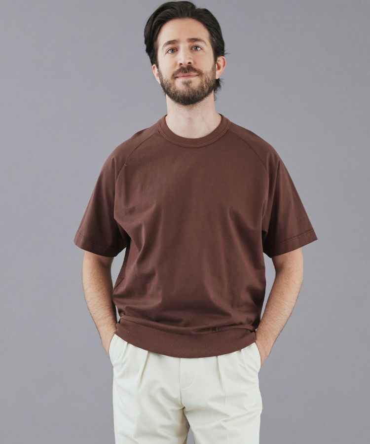 スタイリスト 四方章敬さんが監修した一枚で主役になるアウターTシャツと、シンプルな着こなしに上品なワンポイントを添えてくれるバンダナでつくる、夏のスタイリングセットです。英国らしさを感じるラグランスリーブが特徴的なアウターTシャツは、四方さん曰く“スウェットに近いTシャツ”をイメージしたという一枚。カジュアルになりすぎないよう上品さを追求したバランス、生地感が魅力です。やや深めのネックは、Tシャツの重ね着や首元にバンダナをまいたスタイリングにもよく合います。