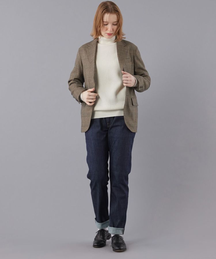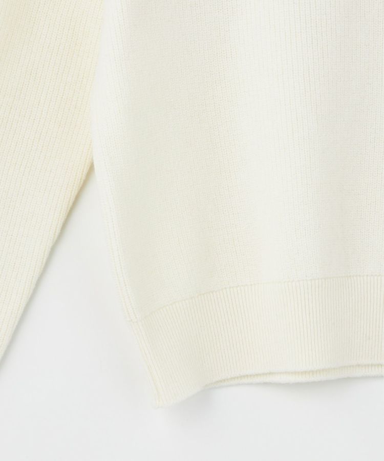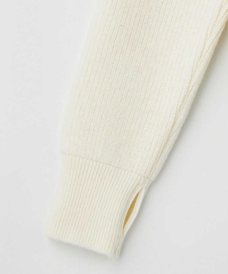 イギリスのサブマリナーニットとガンジーニットをかけ合わせたディテールは、ありそうでないデザイン。太めの毛糸で編まれたバルキーニットでボリューム感のある見た目ですが、軽く着られるように空気を含ませて編んでいます。袖下に三角マチを入れ、腕が上げやすいところも嬉しいポイント。袖口のサムホールに親指を通せばアームカバー代わりにもなり、機能面も充実した1枚です。