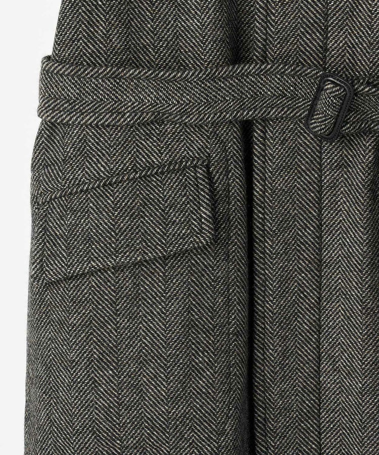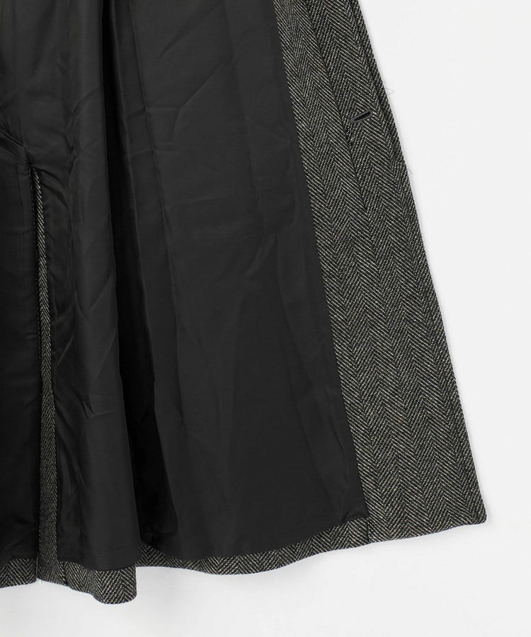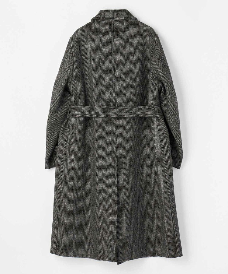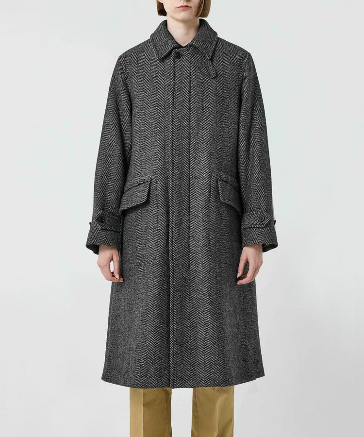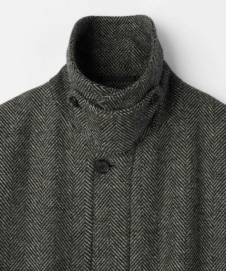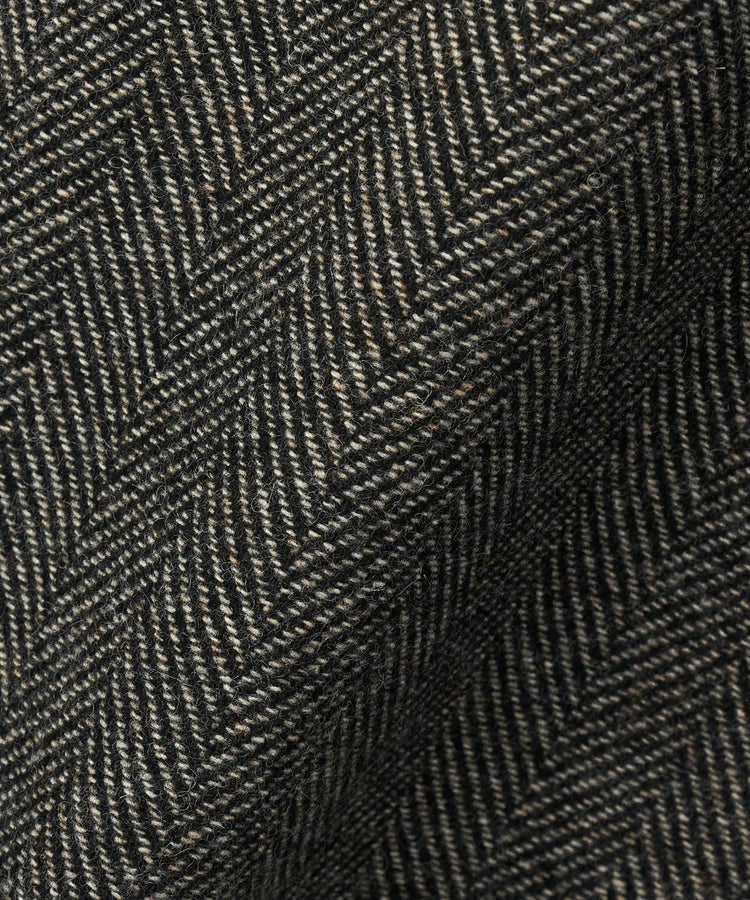 毛織物の産地、尾州で織られた国産生地です。大きめのへリンボ-ン織りがクラシカルな生地です。しっかりと織り上げた生地は、保温性に優れながらも軽やかな着心地。冬の冷たい空気を和らげつつ、洗練されたムードを演出します。