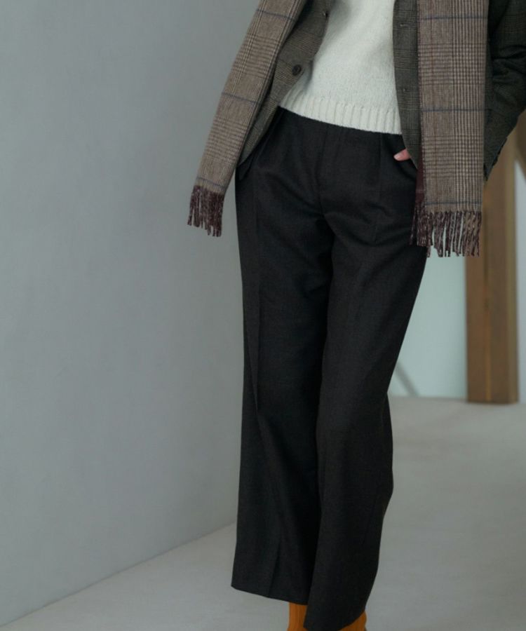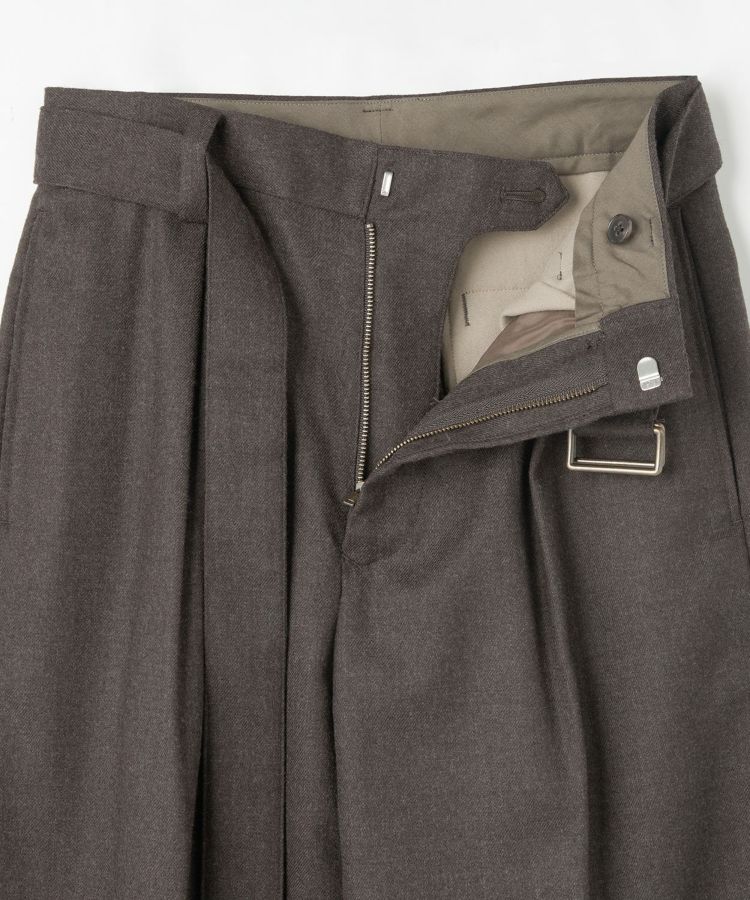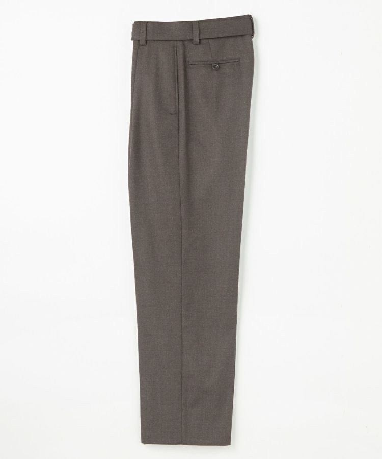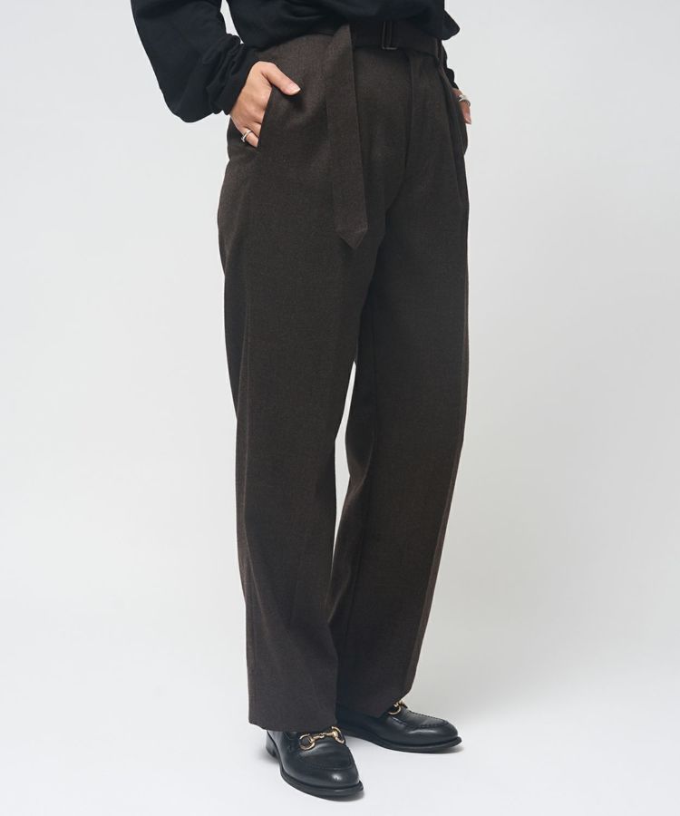 ストレートシルエットにすることでワンクッション入っても、裾上げしても美しいシルエットを出してくれます。2/60の糸を使用し、通常よりタテ糸の本数を増やす事でハリ感のある生地が特徴のハイカウントフラノ素材を採用。スッキリとした印象でオーバーサイズのニットなどと合わせるとこなれた雰囲気に。共地のベルトが付いており、垂らして着るのもおすすめです。