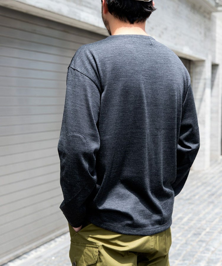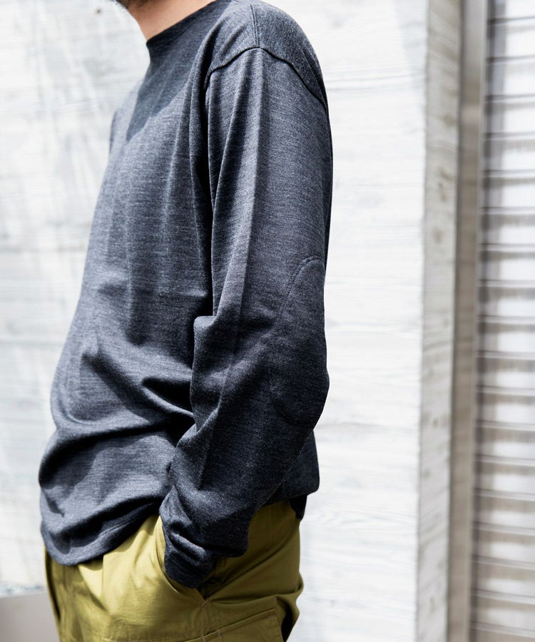 保温性、防汚性、防臭・抗菌性の高い上質なメリノウールを厳選して使用。フライスやリブをソリッドデザインにしたことで、ベースレイヤーで着用したときもアウターに響かずにきれいに着用することが可能です。ネックはリブ無しなのでカジュアルに見えすぎることもなく襟元もスッキリ。1枚で着てもソリッドなシンプルさを感じさせてくれるアイテムです。