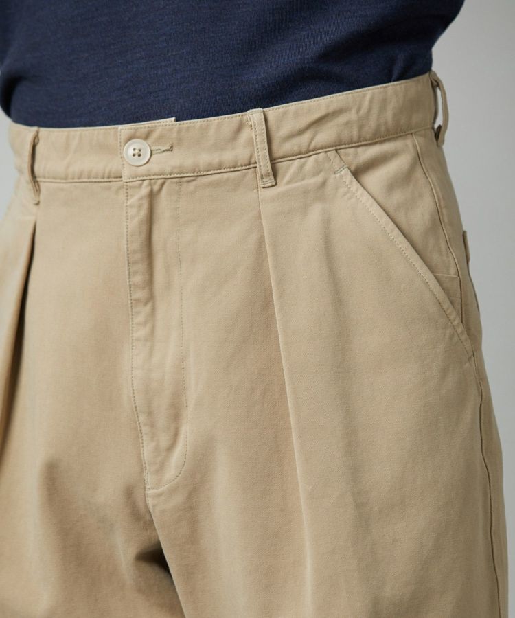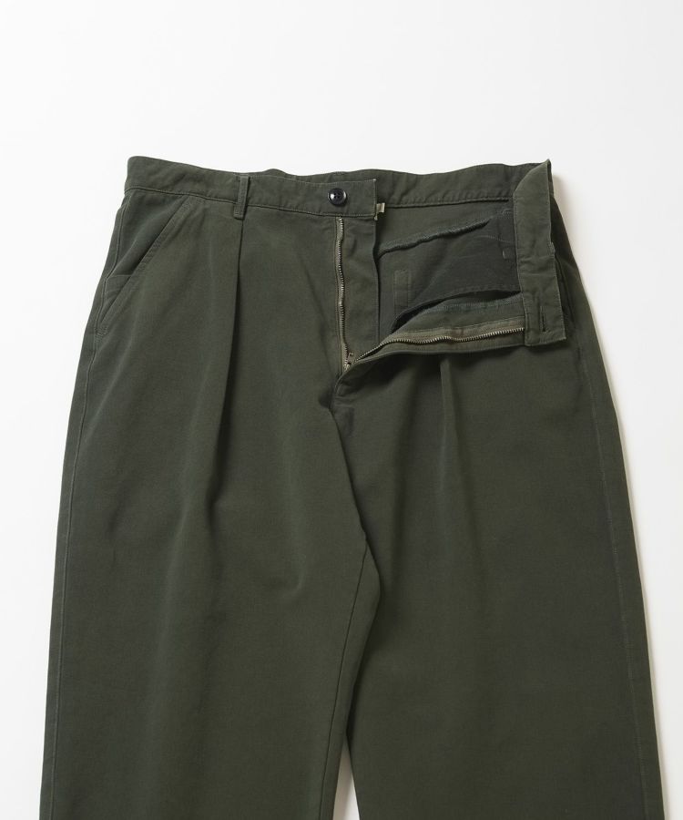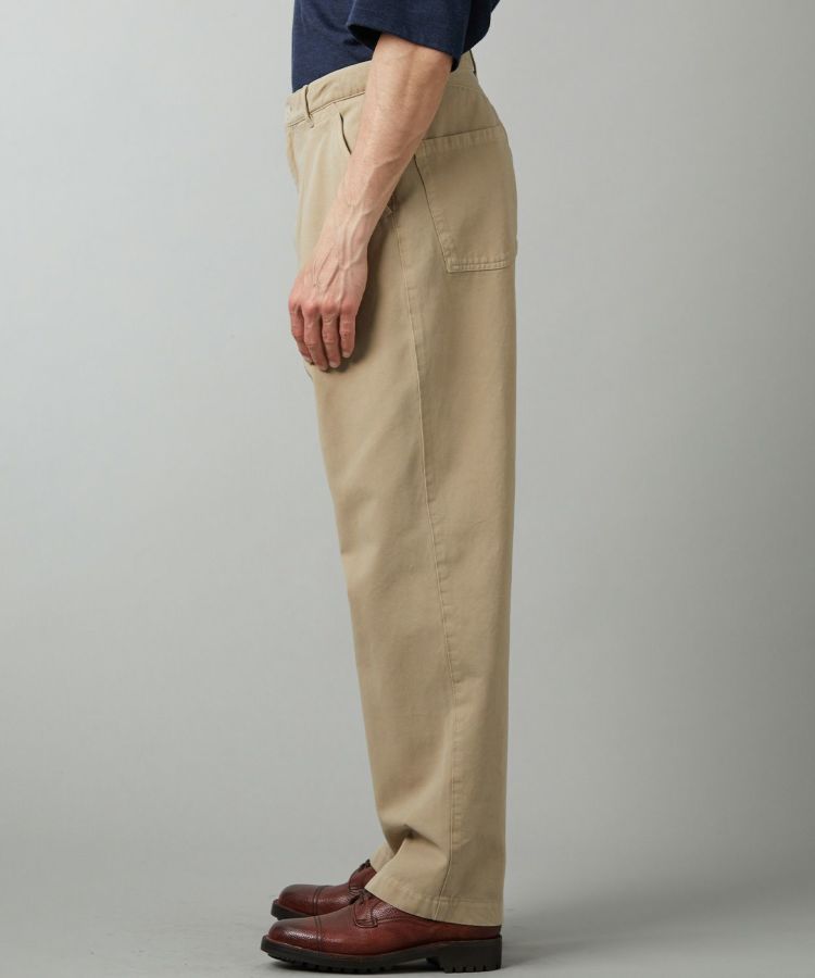 生地は60番双糸に追撚をかけて高密度で織り上げたドライタッチな生地を採用。さらに製品染めをかけることで、表面に独特なしっとりした微起毛感があり、ヴィンテージのような味わいある生地感に仕上がっています。着用を繰り返すと自分の体に馴染みながら、くたっとしたカジュアルな経年変化が楽しめるアイテムです。