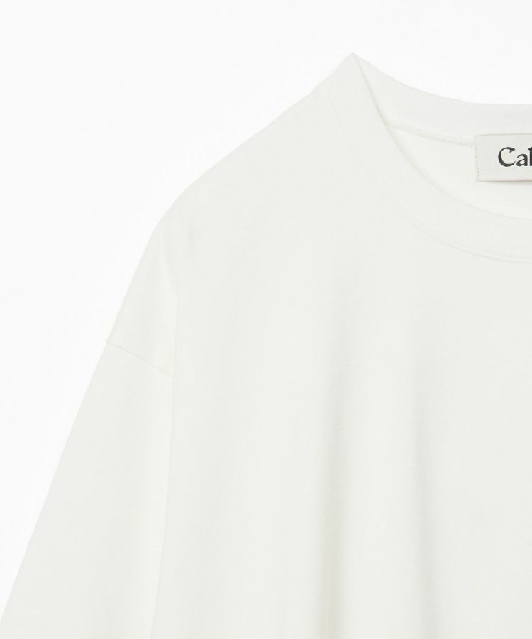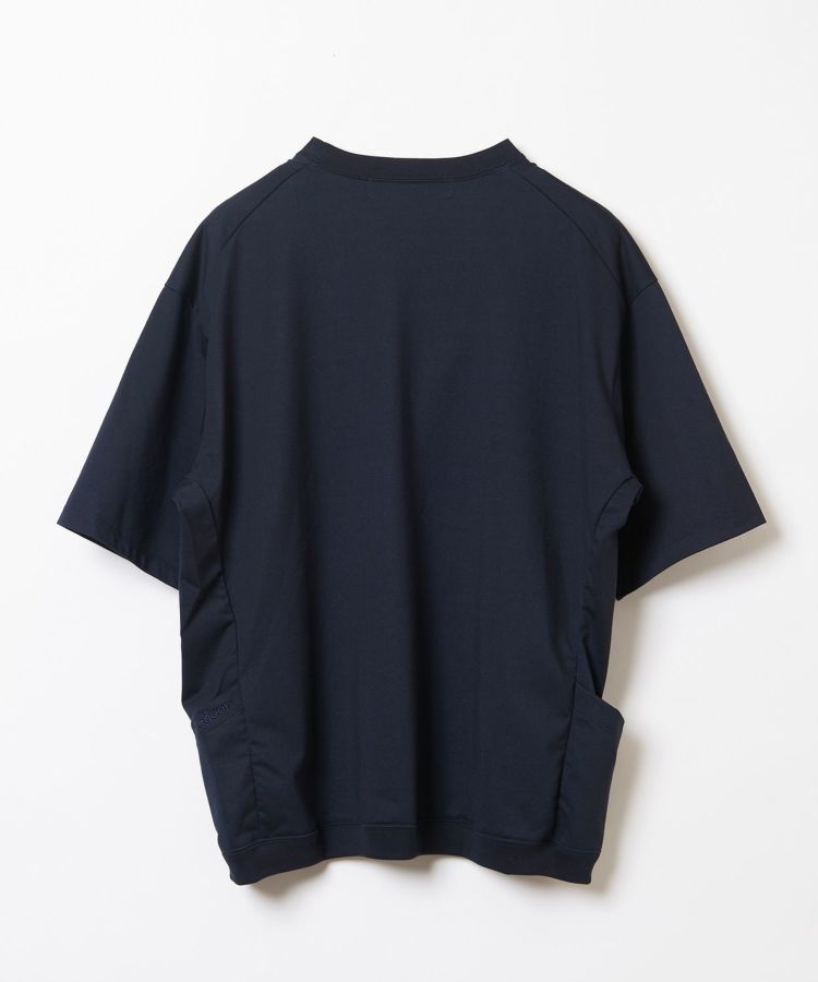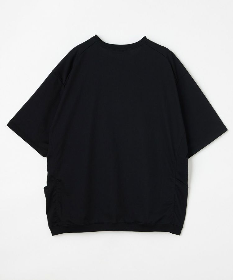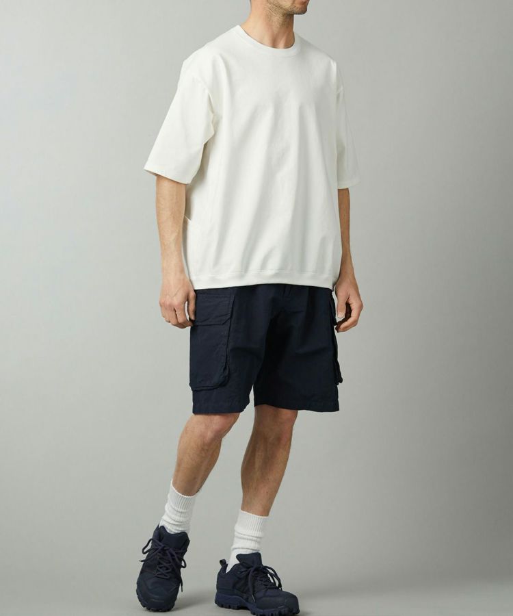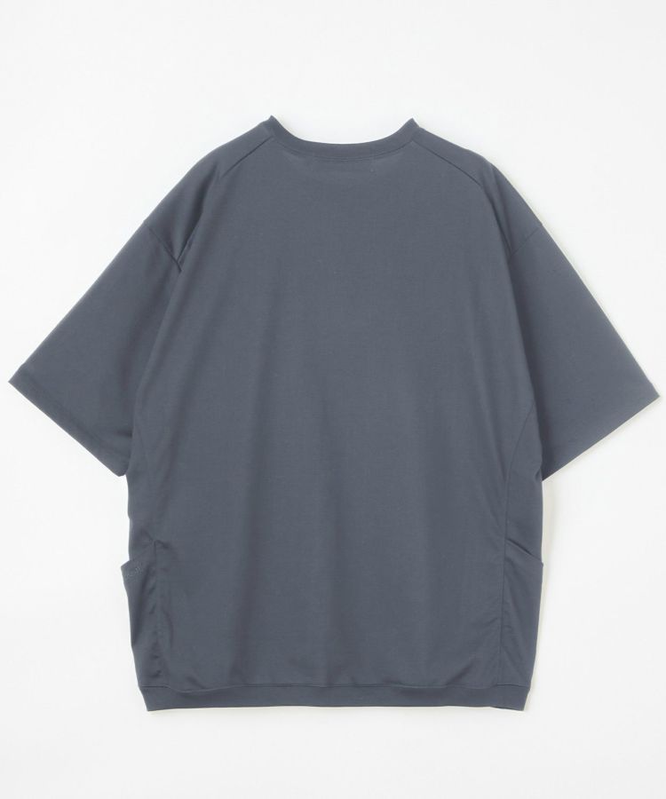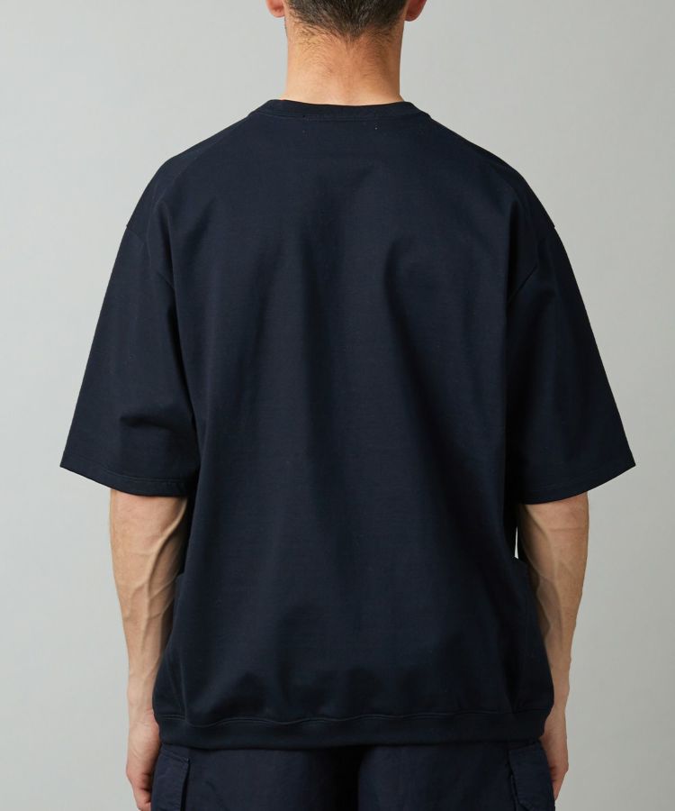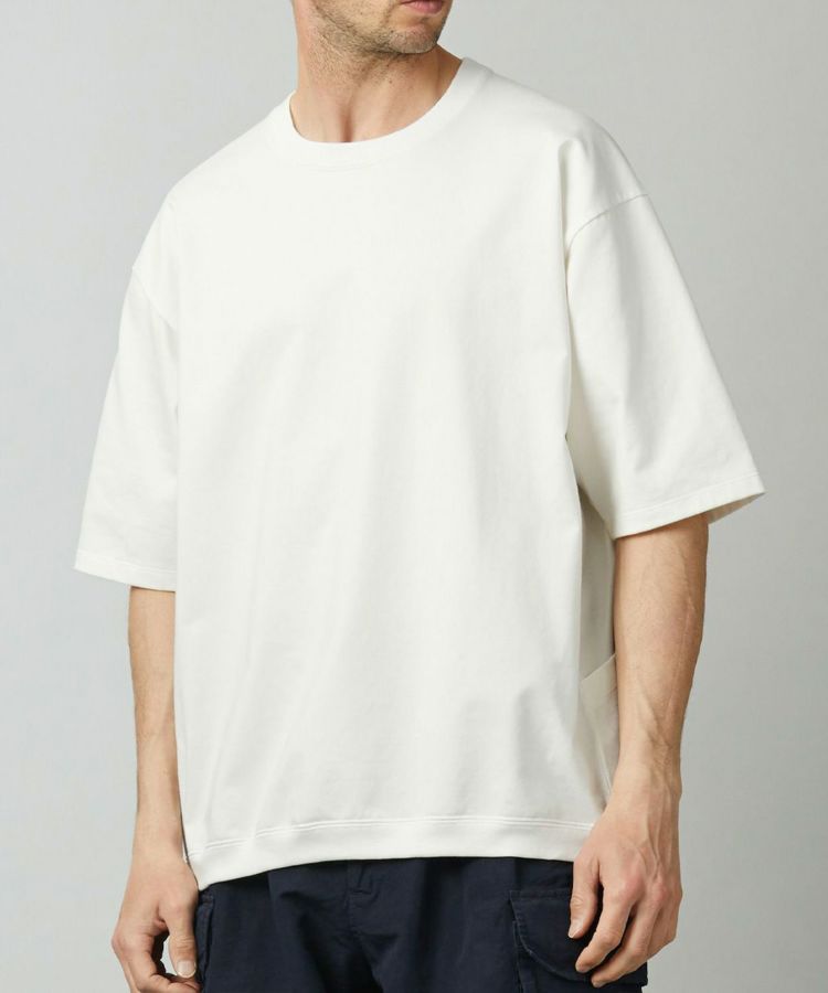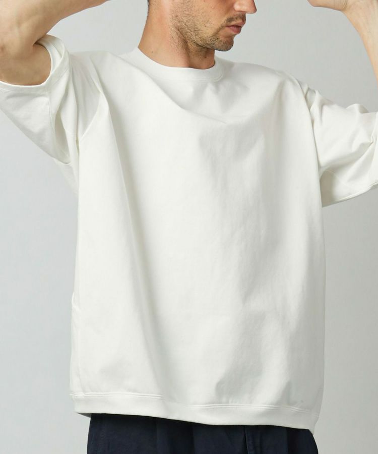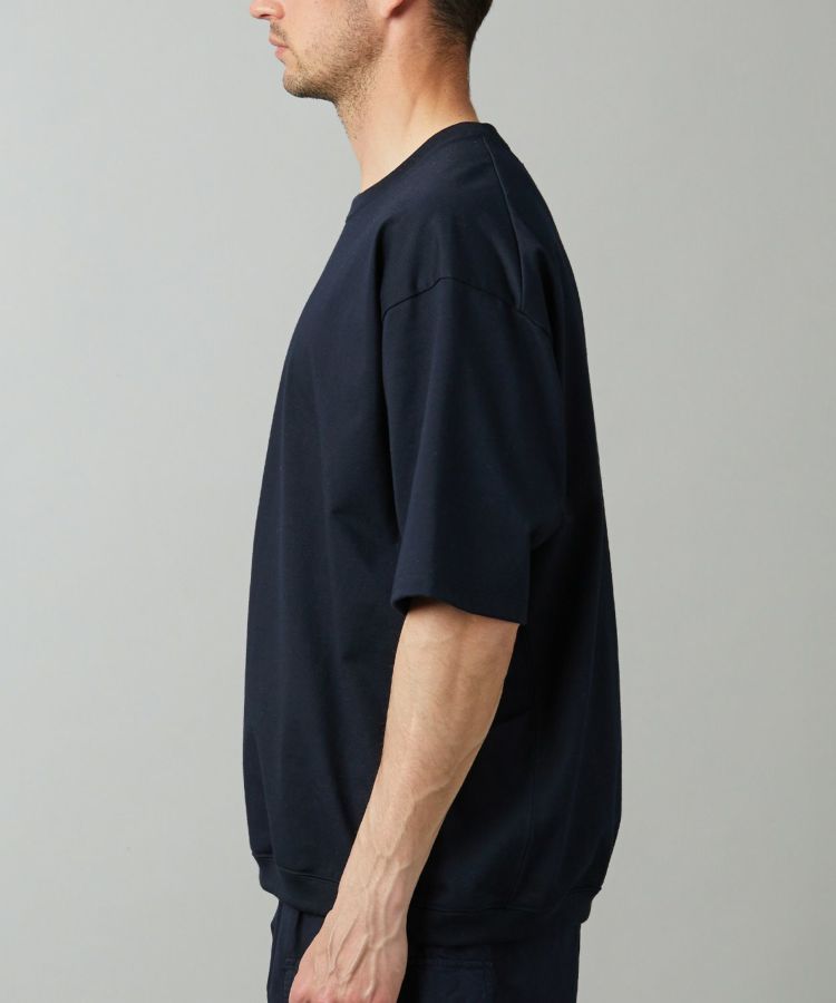 生地はコットンとナイロンをプレーティングしている二重組織素材。表面はコットン100%を使用しているためナチュラルなコットン素材の風合いがあり、裏面の肌に直接触れる部分は速乾性と接触冷感のある機能素材を採用しています。裏面のナイロンの素材感により、コットン100%では表現できない独特なハリとコシのある立体的なフォルムに仕上がっています。