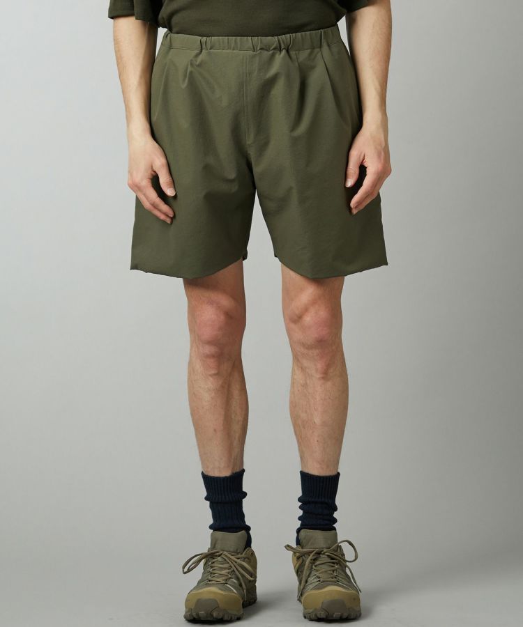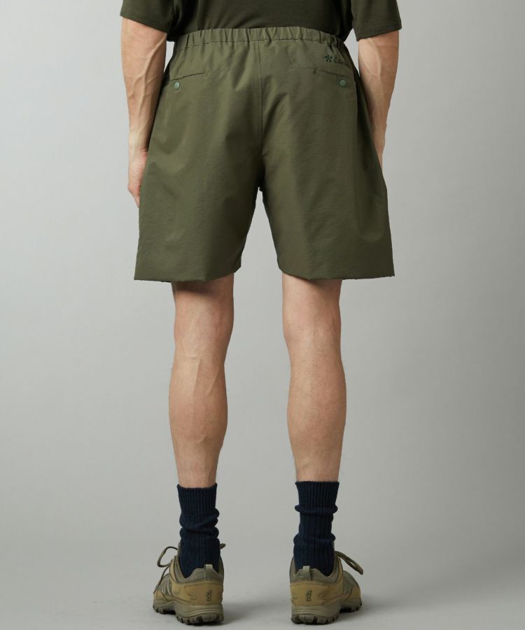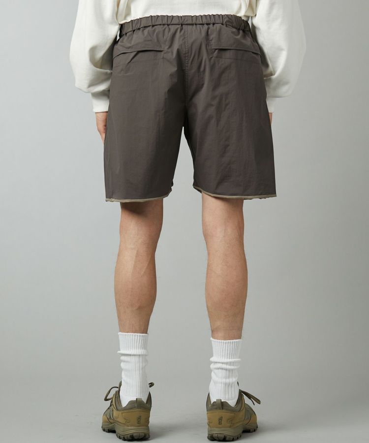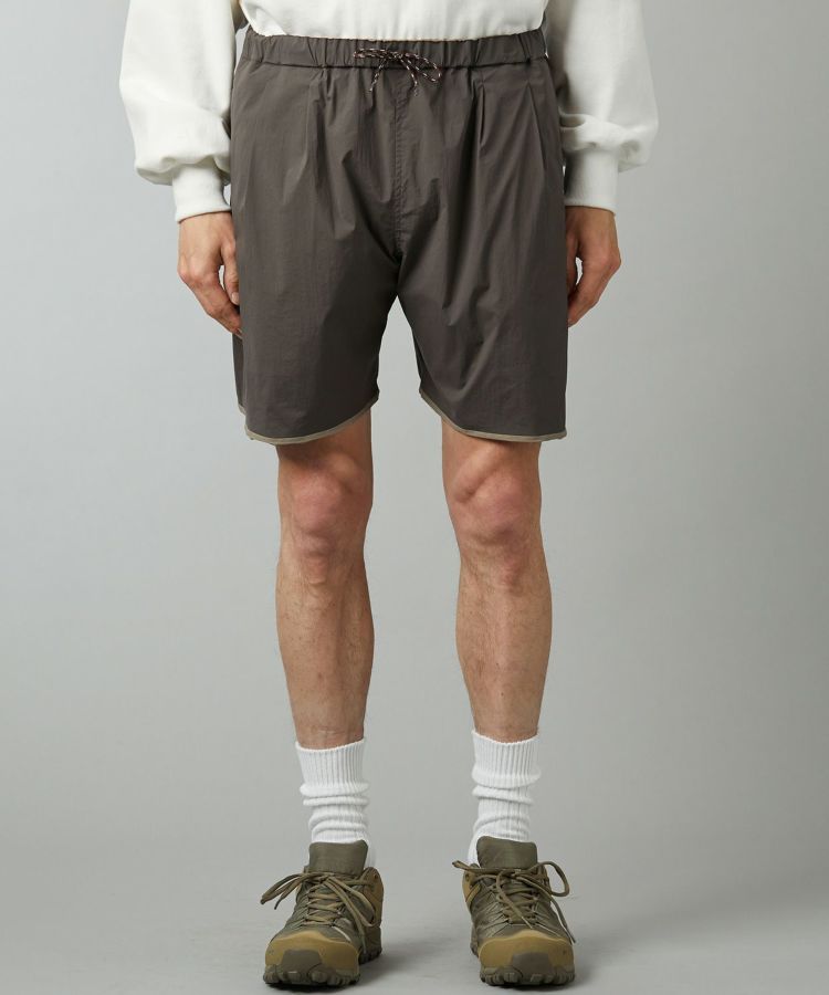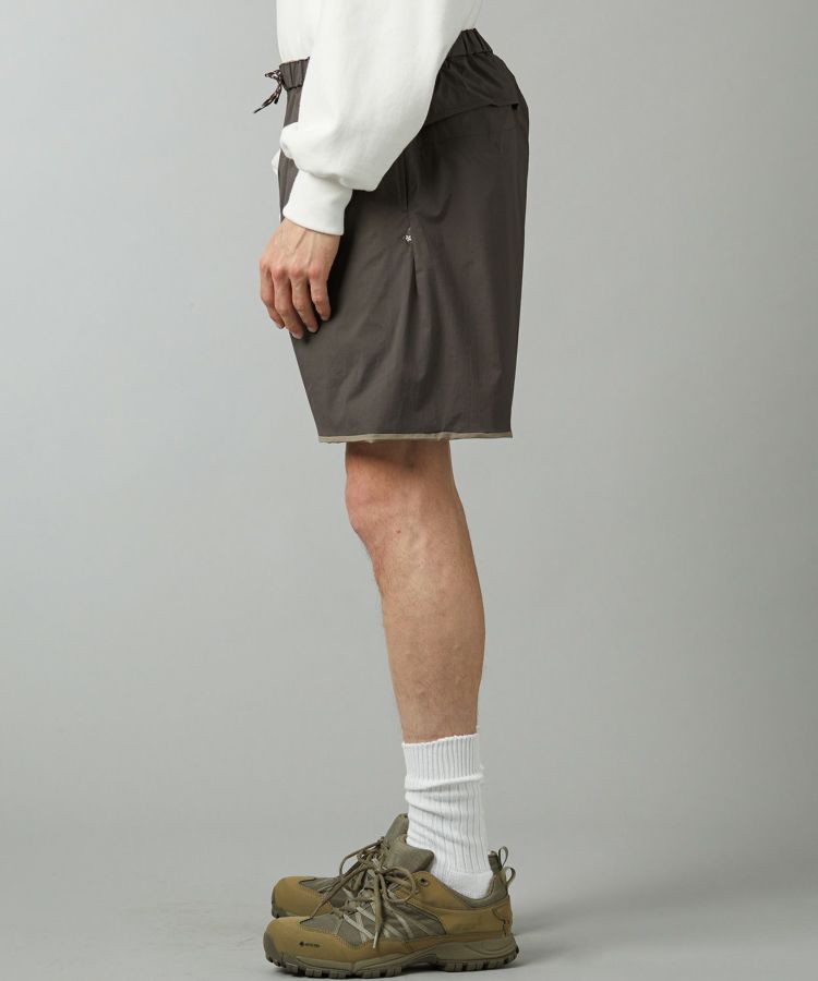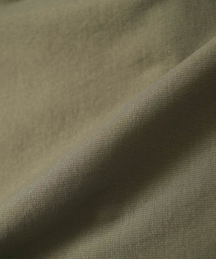 片面にナイロン素材の「クリスピーナイロン」、もう片面にはポリエステル素材の「クールドッツ」をセレクト。クリスピーナイロンはナイロン素材であるにも関わらず、ストレッチ性と強撥水性を持っている素材です。細番手の20デニールナイロンを使用しているため、軽量で動きやすさもある高機能素材。クールドッツは経糸と緯糸の交差するポイントに小さな通気孔のある素材。風通しが良くストレッチ性もあるので、涼しく動きやすい快適な着心地を楽しめます。