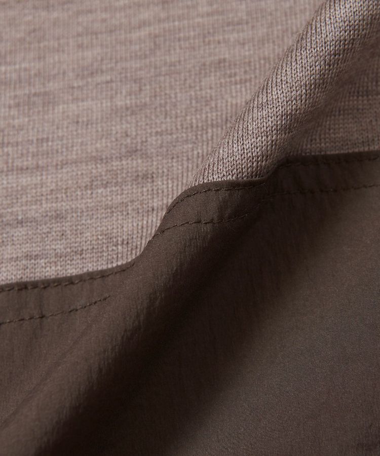 メリノウールは雑菌が付きにくく蒸れや臭いが残りにくい機能があり、体とメリノウールの間の湿度を調節してくれます。朝晩の気温変化や、夏場の冷房での体温調節の場面もしっかり対応してくれる天然の高機能素材です。本アイテムではメリノウール表面にスケールオフ加工(人間の髪でいうウロコのようなものをはがす加工)を施したことで、ソフトでナチュラルタッチな風合いを出しています。スケールオフ加工により、自宅で洗濯ができるウオッシャブルな素材に仕上がっています。