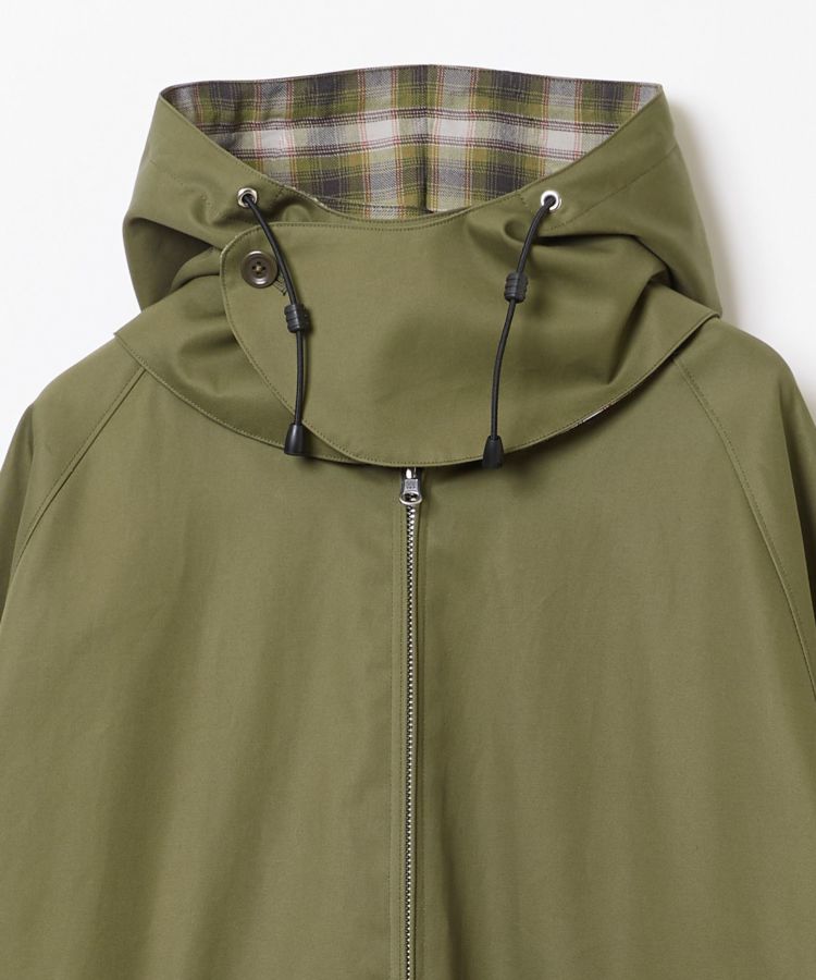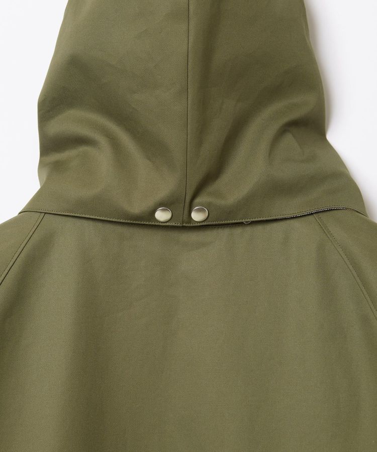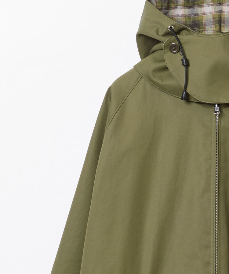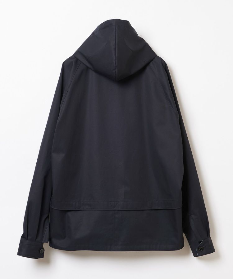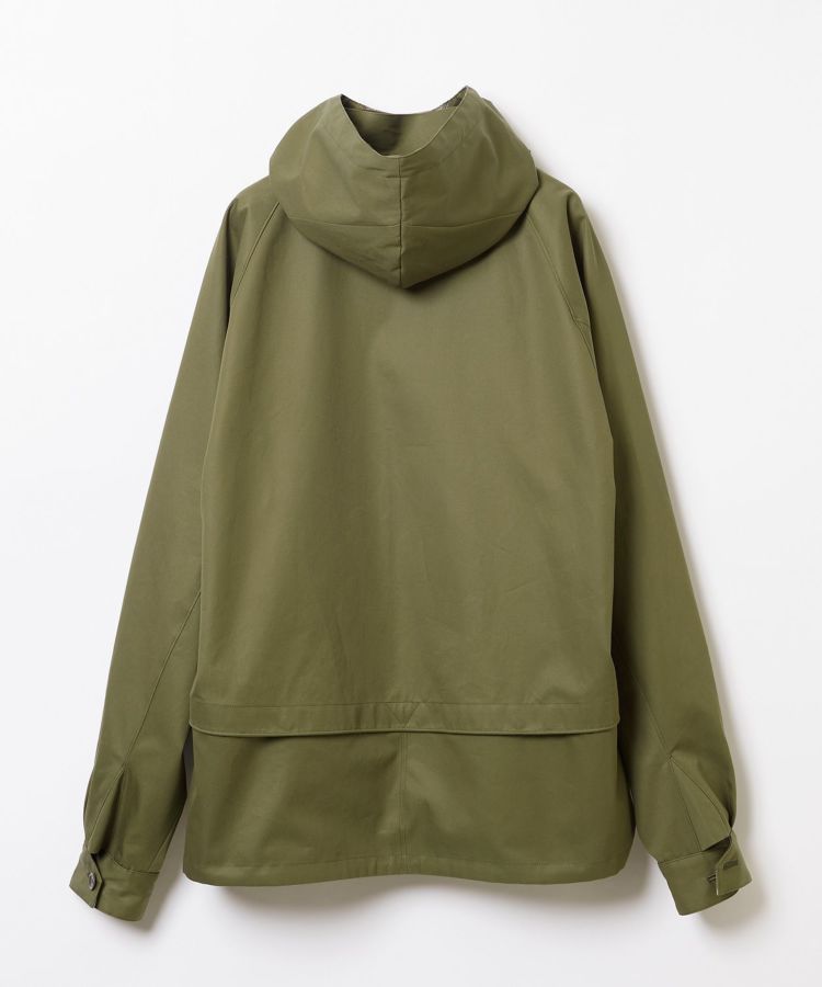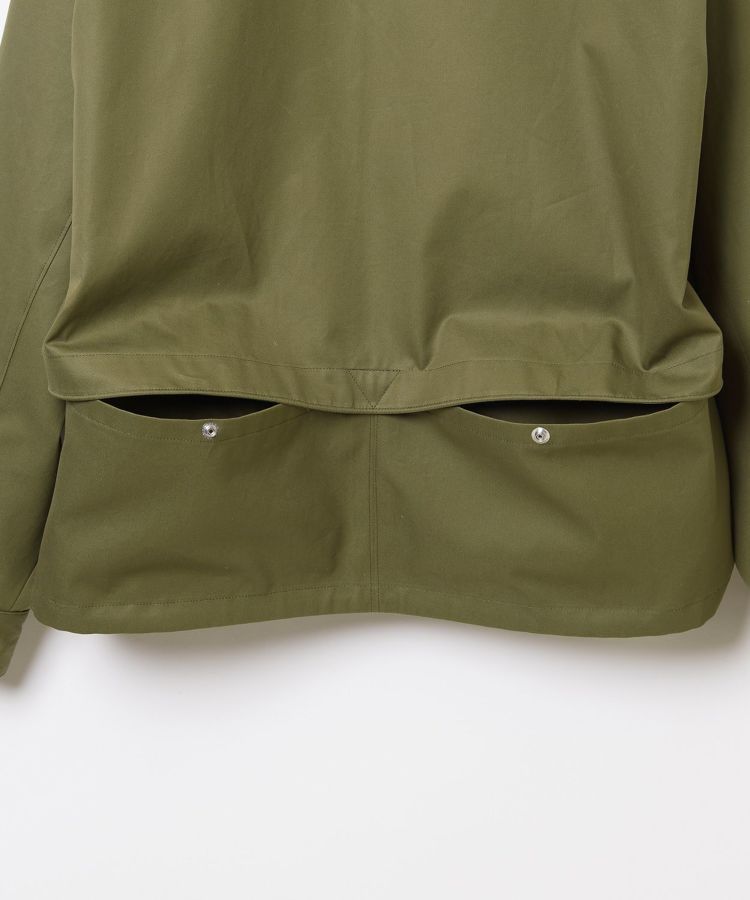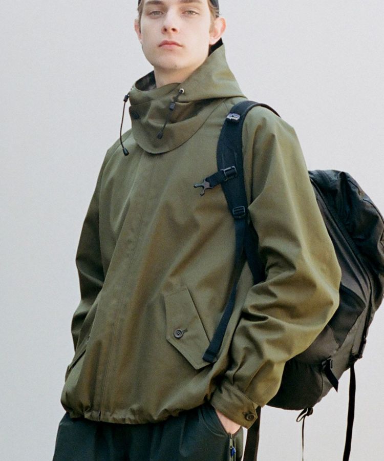 型は身幅を広く取りラグランスリーブにしたことで、インナーとしてニットやスウェットを着込んでも、圧迫感のない“動けるブルゾン”に仕上がっています。また、アンブレラヨークを一般的な位置よりも低めに配置したことで、腰上部にあるゲームポケットに雨が降り込むことを防げる仕様です。腰ポケットに入っているフードは、襟後ろ部分のジップポケット内にあるタブで装着可能なので、アウトドアシーンでの急な天候変化にも対応できるアイテムです。