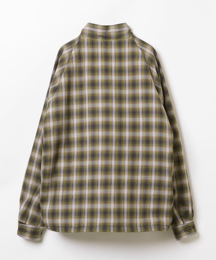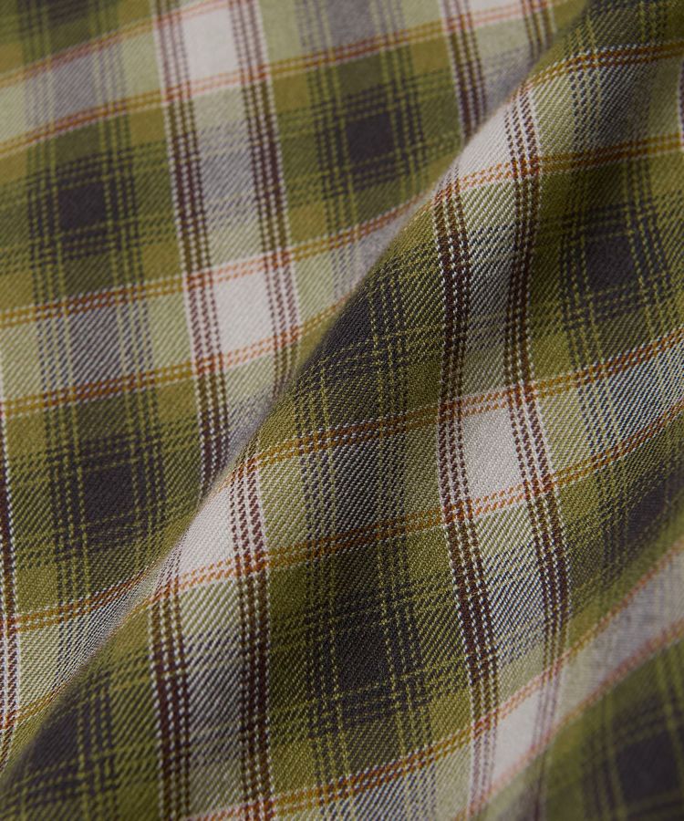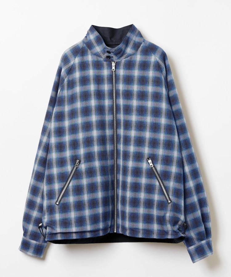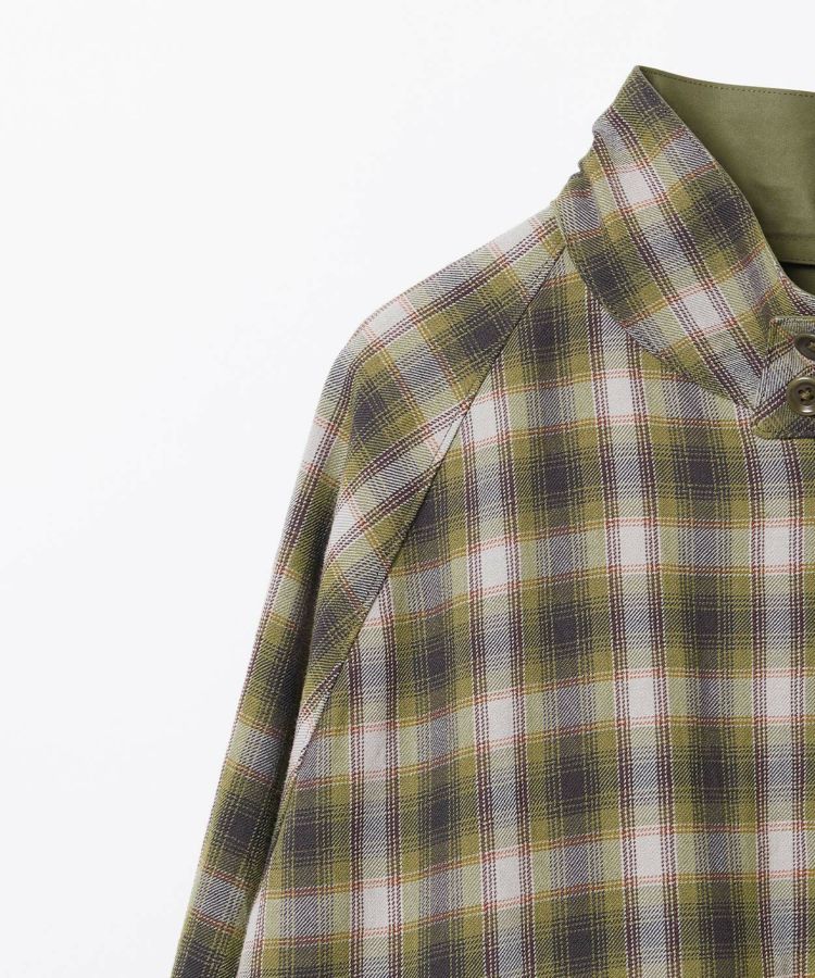 表面にはイギリス空軍パイロット用素材として開発された歴史を持つ高密度織物を使用。日本にて超高密度で織り上げたミリタリースペックな素材であり、撥水・防風・透湿性の機能がありながら、加工により上品さのある滑らかな肌さわりを持っている点が特徴的です。裏面はウールシャツでも使用されているオリジナルチェック柄。オンブレチェックのピッチを小さめに刻むことで、一般的にはカジュアル感のあるチェック柄を繊細で洗練された雰囲気のある仕上げです。