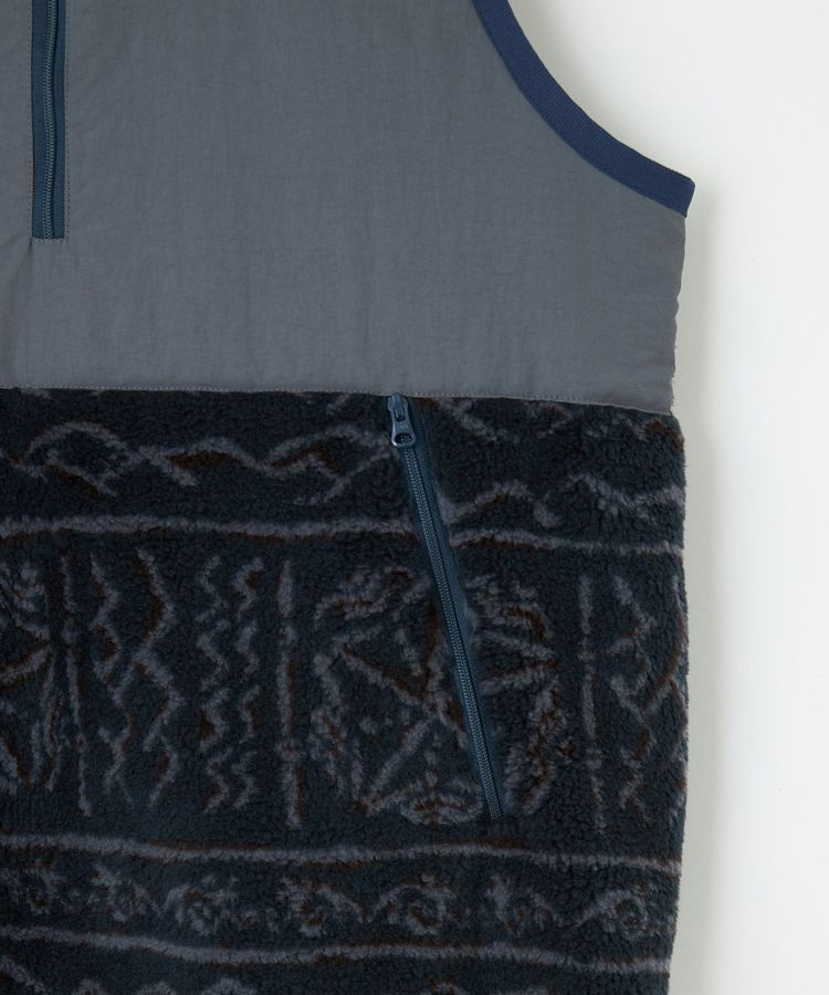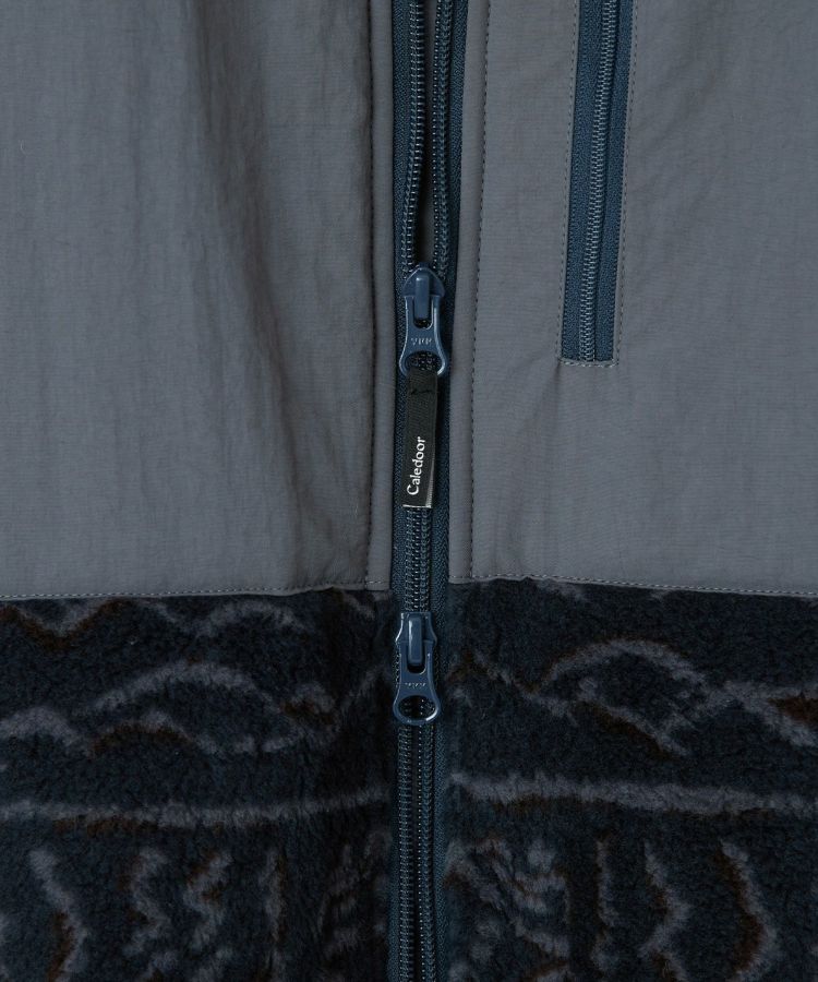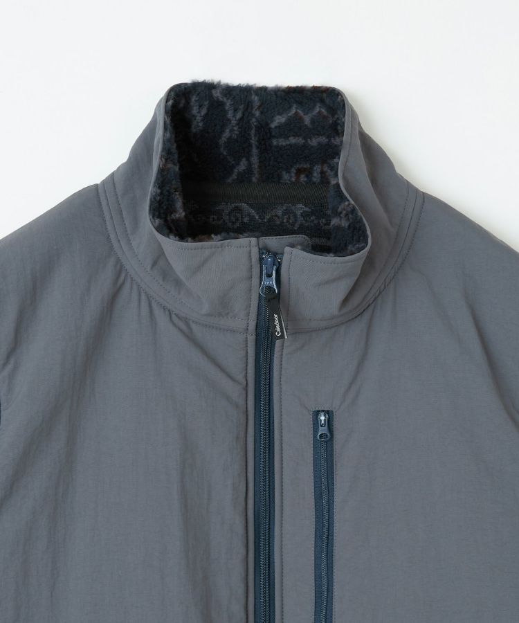 ジャカード織機で織り上げたオリジナル柄のボアを使用し、90年代のオールドスポーツウェアをベースにバルーンシルエットにしています。冷気に対する首の保温性を高めるため、襟を若干高めに仕上げている作りです。
