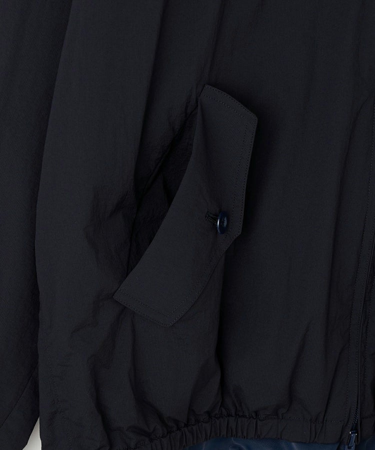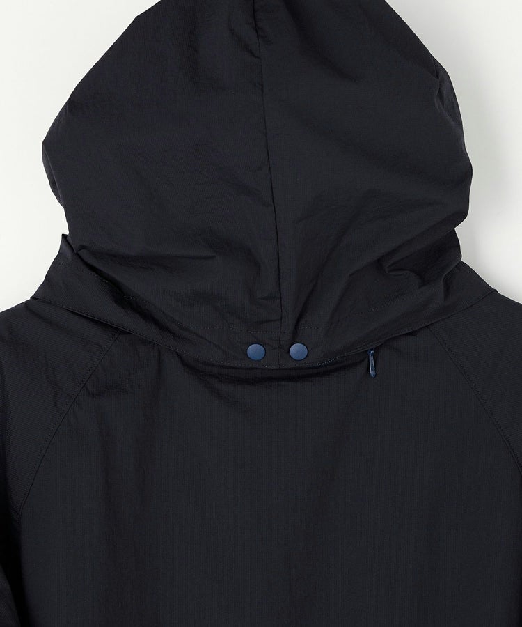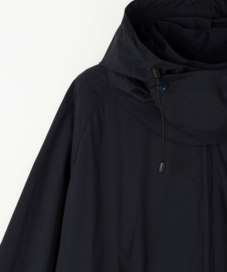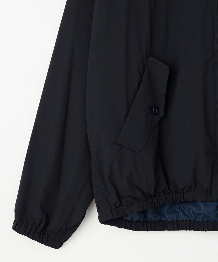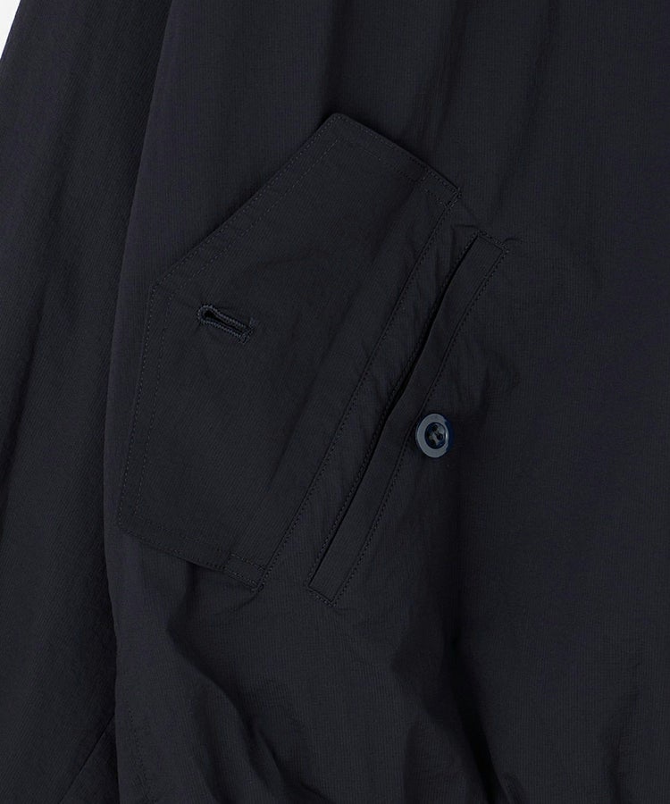 クラシカルなハリントンジャケットとブリティッシュミリタリーのディテールを掛け合わせたデザインです。身幅を広く取りラグランスリーブにしたことで、中に着込んでも圧迫感のない“動けるブルゾン”に仕上がっています。ディテールを簡略化し歩きやすさを追求するため、袖口はカフスからゴムシャーリングへアップデートしています。取り外し可能なフード付ですので、シーンによって使い分けができ印象の変化を楽しめます。