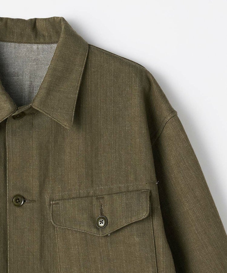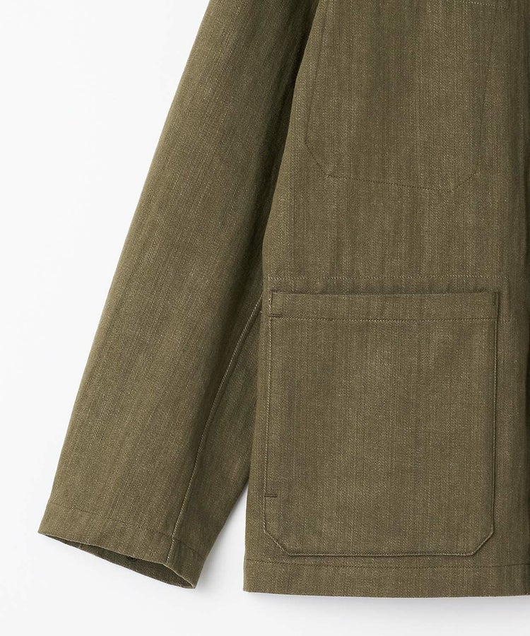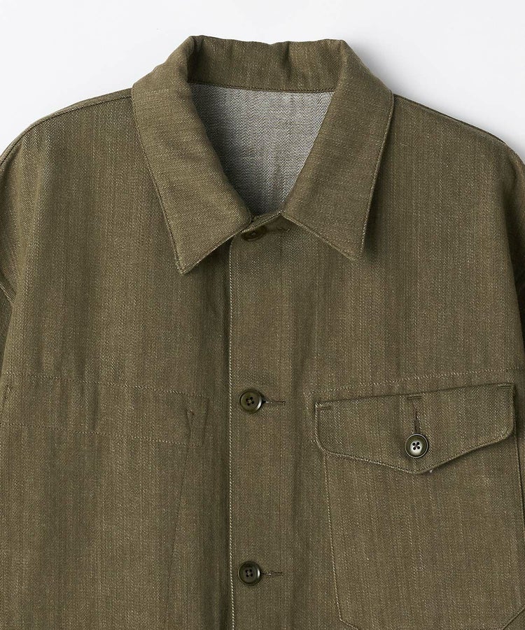 グリーンデニムは30年代から50年代頃に、イギリス軍が使用していた特徴的なデニム生地。綿の柄が入っているような粗野なムードのある生地がヴィンテージ感を漂わせます。着用による色落ちを抑えながらも1970年代のデニムをクタッとさせたような風合いが魅力です。自分の体型や動き方に合うエイジングが楽しみなアイテムです。