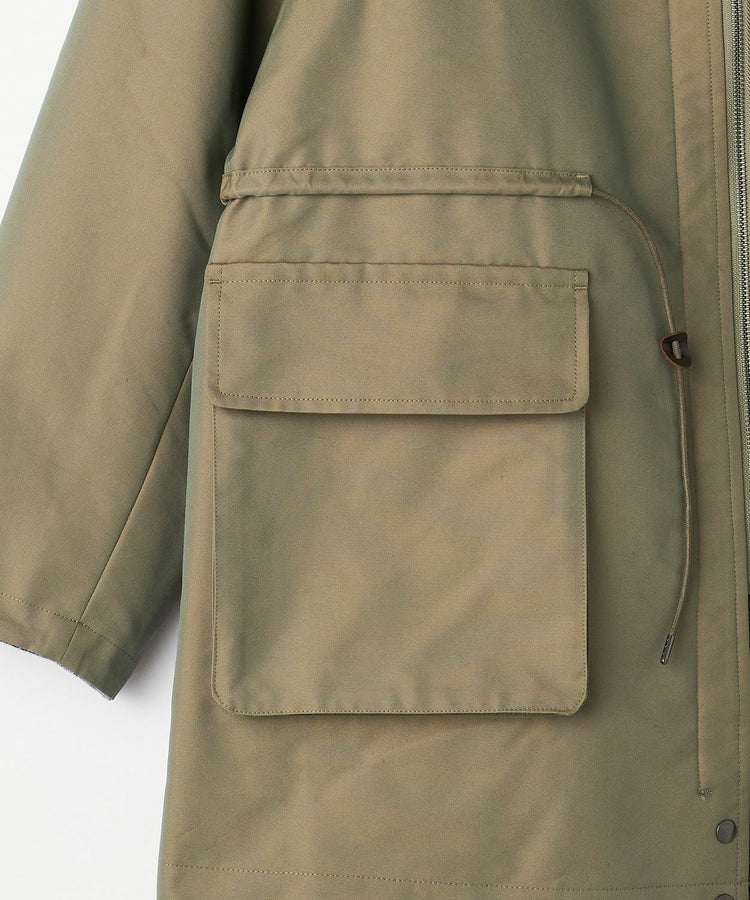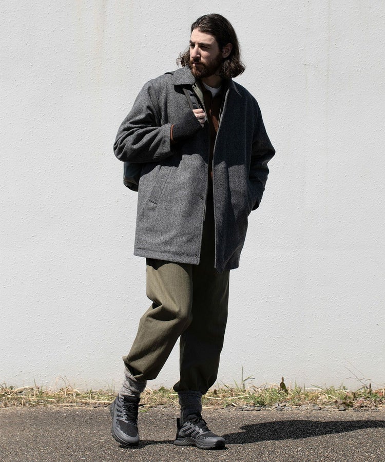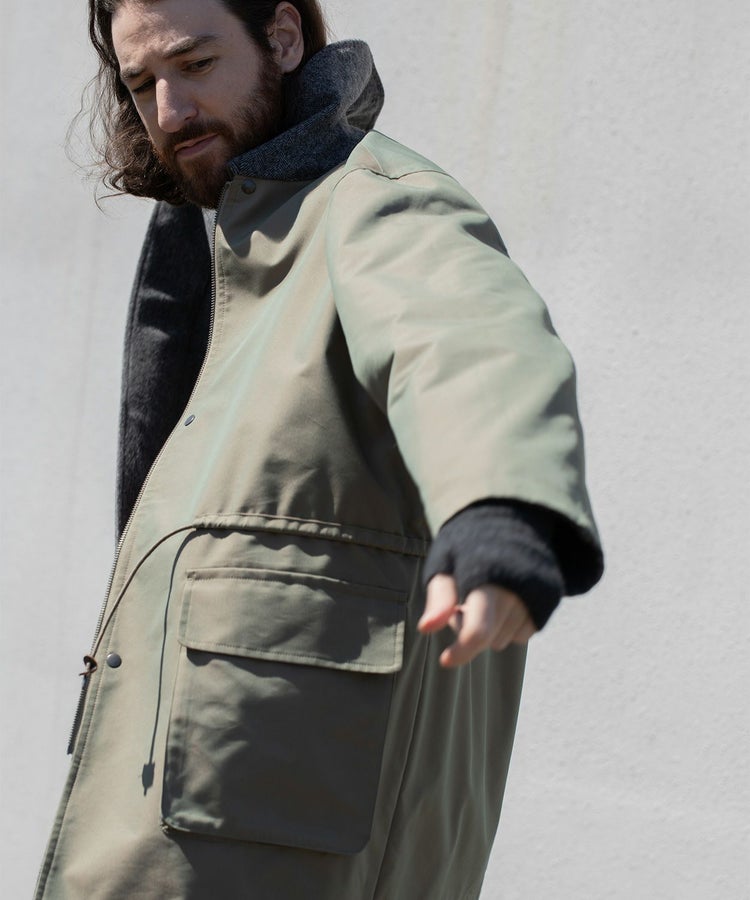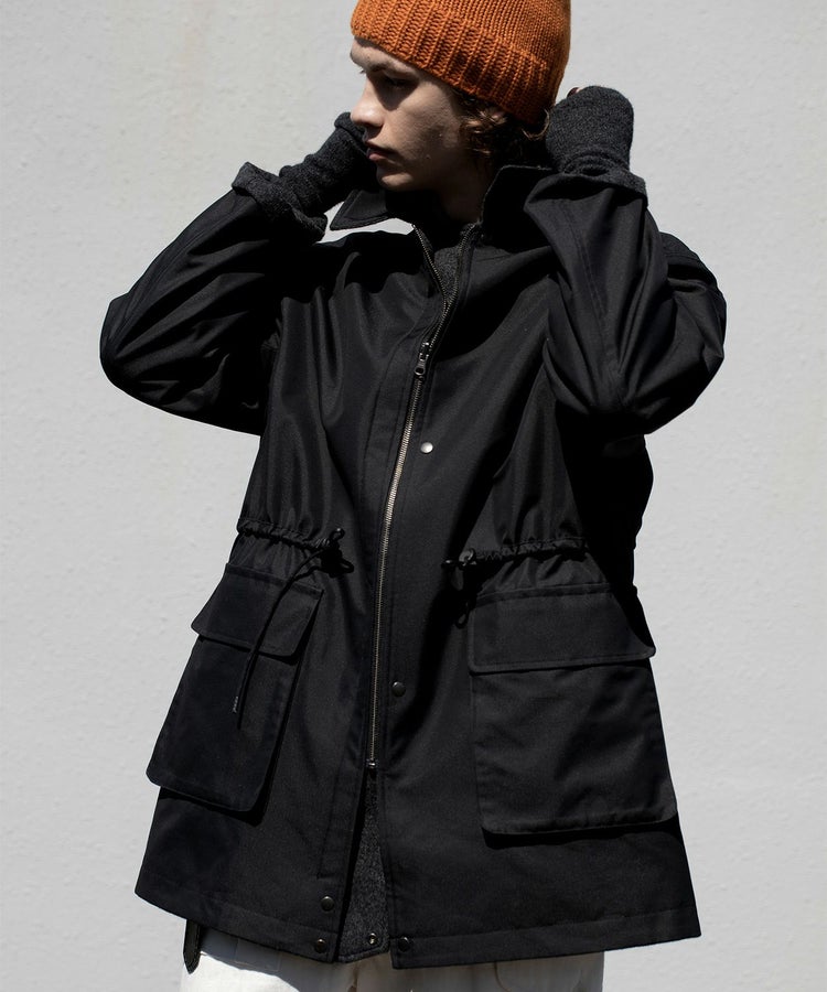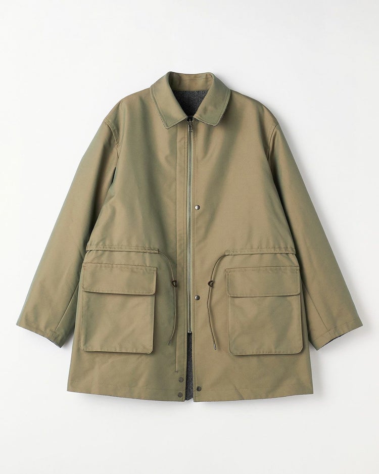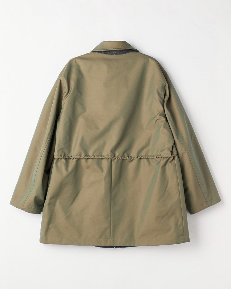 ウエストに配したドローコードによって、シルエットの変化を楽しむことができます。実用性を追求した収納設計が特徴で、左右のポケットはそれぞれ3方向(上部、横、フラップ下)からアクセス可能。タンブラーや折り畳み傘などを収納しても、両手を空けたランブリングを楽しめます。さらに、快適な着用感を実現するため、背面ヨークに設けた空気孔が熱をスムーズに逃がし、ムレを軽減する仕様になっています。リバーシブル仕様により、その日の気分や天候に合わせて表情を変えられる、多彩な活用が可能なコートです。