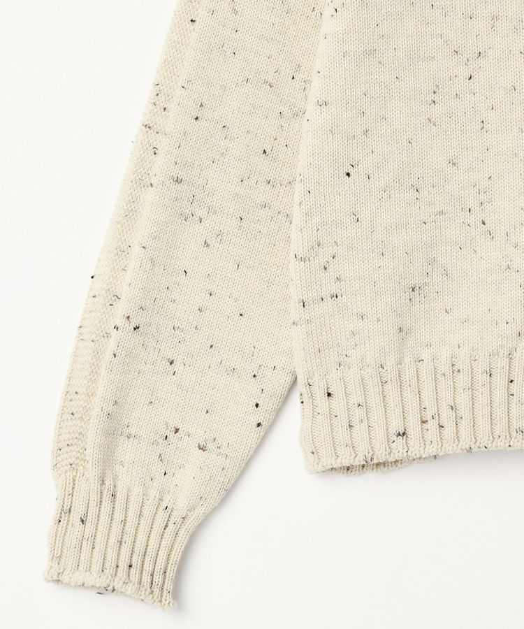 素材は日本であまり見かけない、イングランドのペナイン山脈中部に位置するShepley Yarns社の「マリオラメリノ」を使用。メリノウールの原産地であるスペインの生産者と提携して作られた糸で、虫害や病気予防のための"ミュールジング"を行わない環境に配慮した原毛を使用しています。Guernsey Woollens初のメリノウールを使用したニットアイテムです。糸にはわずかに紡績油が残されており、編み上がり後にウール用洗剤で洗い上げることで、よりふっくらとした密度のある風合いへと変化します。