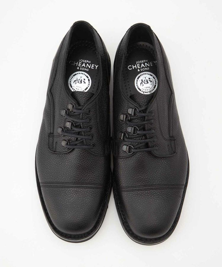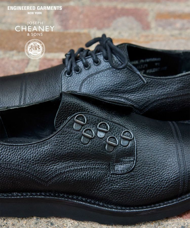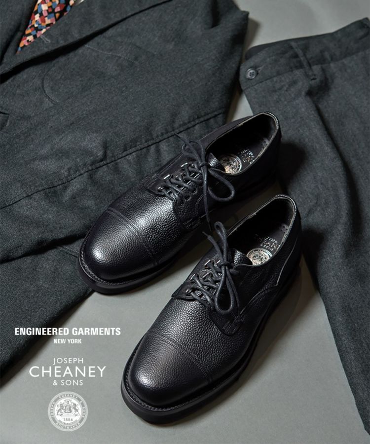 世界中から絶大な支持を集めるENGINEERED GARMENTSとの別注が実現したスペシャルモデル「CAIRNGORM EG(ケンゴン)」。 アッパーのシューレース部分の片側だけにDリングを配置して、左右からの見え方が異なるENGINEERED GARMENTSらしい仕様。5つのアイレットをDリングで置き換えるために、ジグザグに配置した他にはないデザインです。 ソールは驚くほど軽やかな履き心地を実現するVibram Morflexソールを採用。ボリュームのある見た目ながら、軽くてクッション性が高く歩きやすさは抜群です。インソール には別注の証として2ブランドのダブルネームが入っています。 ラスト(木型)は、オリジナル同様イギリスでは“ミリタリーラスト”と呼ばれている「4436」。英国軍靴に使用されていた背景を持ち、日本で展開されているモデルの木型の中でもっとも歴史が古く、75年以上前から存在すると言われています。ノーズが短く丸みを帯びた愛嬌のあるフォルムに、外羽根式でダブルのツインステッチがミリタリーシューズらしい風格。 アッパーの縫い付けは伝統的な製法“ヴェルトショーン仕様。アッパーとウェルトの隙間から雨水が染み込み、小石や土ほこりなどが侵入するのを軽減する役割があります。雨の日でも滑りにくく、作りも極めて丈夫なので、天候を問わず長く愛用いただける頼りがいのある1足です。 ↓このアイテムを使った関連記事はこちら↓ ・〈ENGINEERED GARMENTS〉 X 〈JOSEPH CHEANEY〉コラボレーションモデルが初登場 ◆この商品の特徴 ・ENGINEERED GARMENTS別注デザイン ・シューレース部分の片側だけにDリングを配置したアシンメトリーデザイン ・外羽根式 ・ミリタリーシューズ ・75年以上前に制作された歴史のある木型「LAST4436」 ・希少なヴェルトショーン製法 ・ホコリや雨水を防ぐベローズタン ・ダブルのツインステッチ ・ノーズが短めでボリュームのあるラウンドトゥ ・締め付け感がなくリラックスして履ける広めのウィズ ・軽くてクッション性の高いビブラムモルフレックスソール カラーバリエーション BURGUNDY BLACK ◆そもそも、ミリタリーシューズとは? その名のとおり、軍靴を由来とするミリタリーシューズ。デザイン上の大きな特徴となるのは、丸みを帯びたトウと全体的にボリュームのあるがっしりしたシェイプ。これはもともと、戦線に赴く兵士たちへ安定した品質の物資を大量に供給することが求められた戦時下において、さまざまな足の形にフィットする合理的な形状として考案されたものでした。 しかし、後年になると素朴でありながら独特な味わいがあり、男らしさを感じさせるデザインがファッションアイテムとしても注目されるようになります。過酷な戦地を踏破するために採用された頑丈な作り、そしてミリタリーシューズならではのディテールも機能美として愛好されてきました。 実はジョセフ チーニーも、英国軍への供給実績をもつブランド。当時、軍に採用されたラスト(木型)とデザインを踏襲して現在ラインナップするのが、「ケンゴン」です。タフな作りもさることながら、ミリタリーシューズならではの独特なディテールが随所に見受けられます。 ◆今や希少な「ヴェルトショーン製法」 「ケンゴン」の大きな特徴となっているのが「ヴェルトショーン製法」と呼ばれる仕立て。本格靴の主流であるグッドイヤー製法と似ていますが、こちらはソールの上を覆うようにアッパーの革を縫い付けているのがポイントです。 グッドイヤーの場合、アッパーがウェルト(アッパーとソールを繋ぐための細い帯状の革)の内側に潜り込む形になるため、この隙間から雨水や細かいホコリが靴の中に入ってきてしまいますが、隙間のないヴェルトショーンではこれを防ぐことができるというわけです。 悪路の多いミリタリーシーンで重宝されてきた作りですが、非常に手間がかかるため、今では歴史ある英国靴メーカーでもヴェルトショーン製法を行っているところはごくわずか。機能性に加えて、デザインのアクセントとしても効いています。 (上画像:ライニングを釣り込み、そしてアッパーを釣り込む前の状態。この状態からウェルトにアッパーを被せてスライスしていく) アッパーを全体に適切なテンションを掛ける為の意匠など熟練の職人技、そして専用のマシーンを必要とするため生産できる数も非常に限られる手の込んだ仕様は、まさに質実剛健さを体現した英国的ディテールの代表格。その中でもチーニーは今も尚ヴェルトショーンで作り上げることが出来る数少ないノーザンプトンのシューメーカーの1つだと言われています。 ◆ホコリや雨水を防ぐ「ベローズタン」 一見わかりにくいのですが、シューレースを外すとさらなるミリタリーディテールが。足の甲を覆う “ベロ”が羽根の部分と繋がっていることがわかります。これは「ベローズタン」と呼ばれる仕様で、トレッキングシューズなど登山靴とも共通する作りです。ベロと羽根の間からホコリや雨が入ってくるのを防ぐた