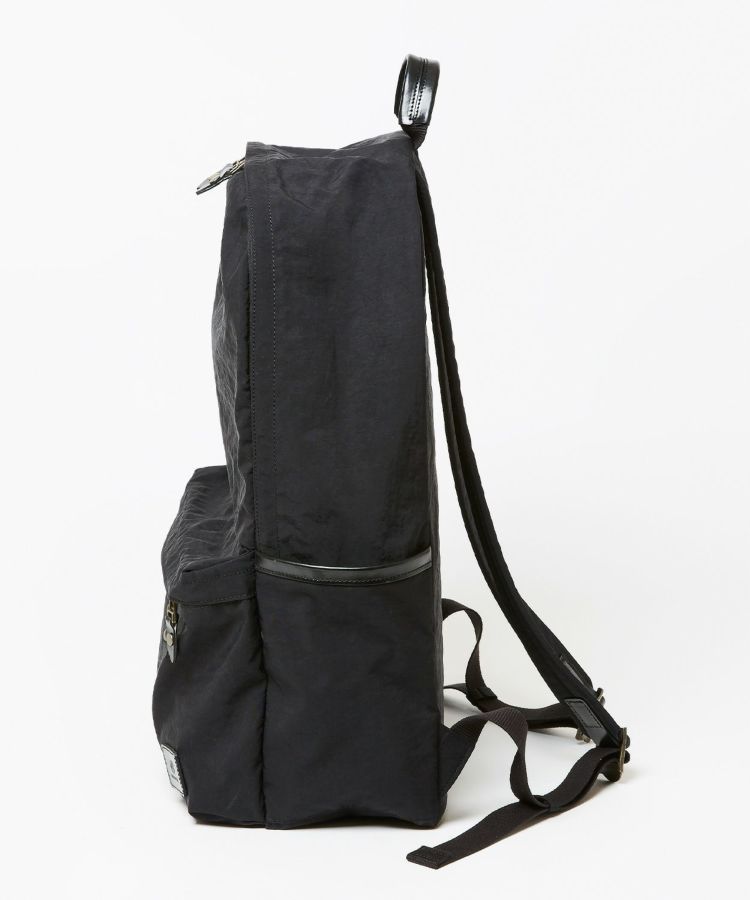 13inch程度のラップトップが入り、幅広いシーンに対応。大きめのサイドポケットの他にファスナー付きフロントポケット1、中にPCが収納できるパッド入り内ポケットが付いています。GLENROYALらしいレザープラーやパイピングで高級感もプラス。軽くて容量も充分なデイパックは飽きの来ない形で様々なコーディネートに合わせやすいところもポイント。ナイロン生地にはアクリルをベースとしたバッグコーティング剤(広塗布用)を塗布し、優れたハリ感と撥水機能を持たせました。ブライドルレザーと撥水ナイロンを組み合わせシーズン問わずお使いいただけるアイテムです。