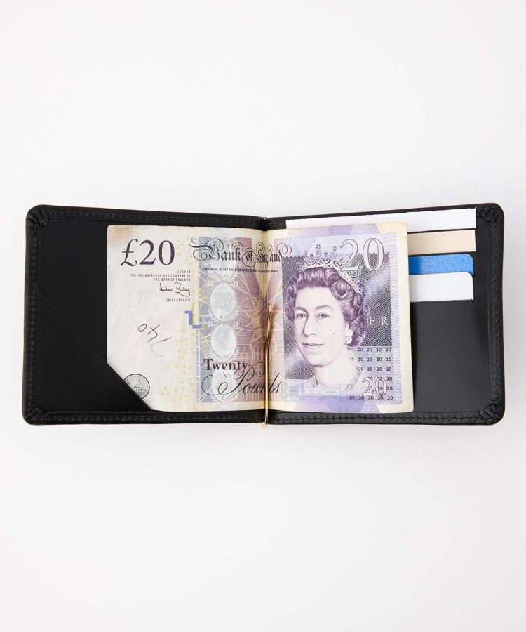 最も薄い財布でポケットなどに入れてもストレスフリー。シンプルな設計でありながら、お会計に必要な最低限の要素は完備。ゴールドのクリップは複数の紙幣をしっかり挟むことができ、なおかつ一枚だけを抜くのに丁度よい絶妙なホールド力。三角形にカットされたレザー部分は、お札を整え収める役割を果たします。