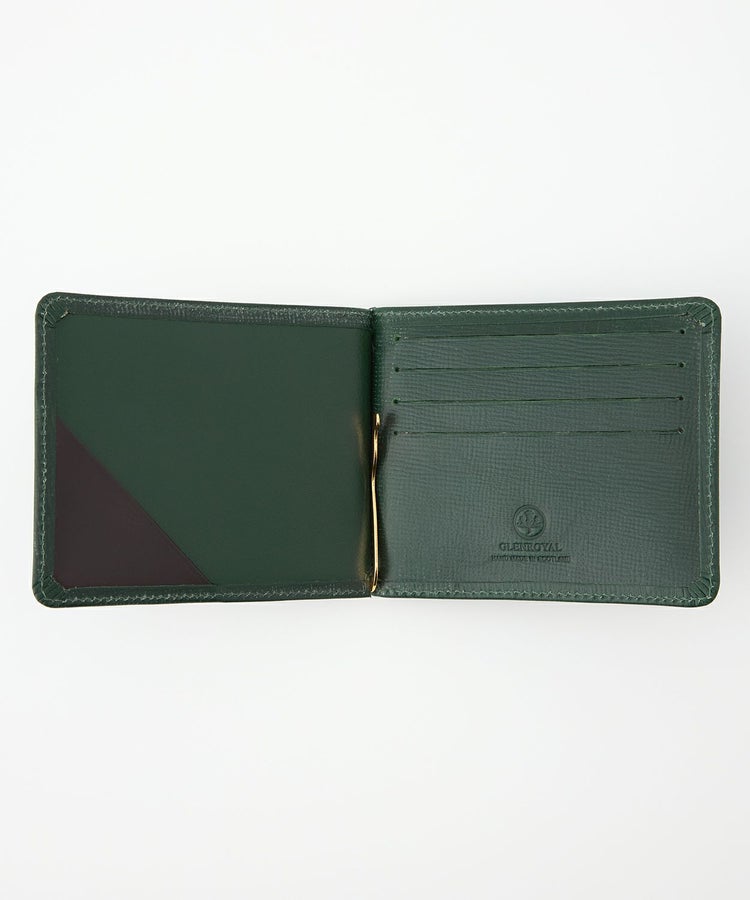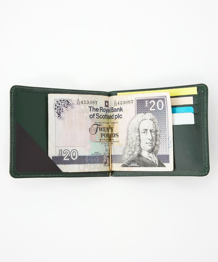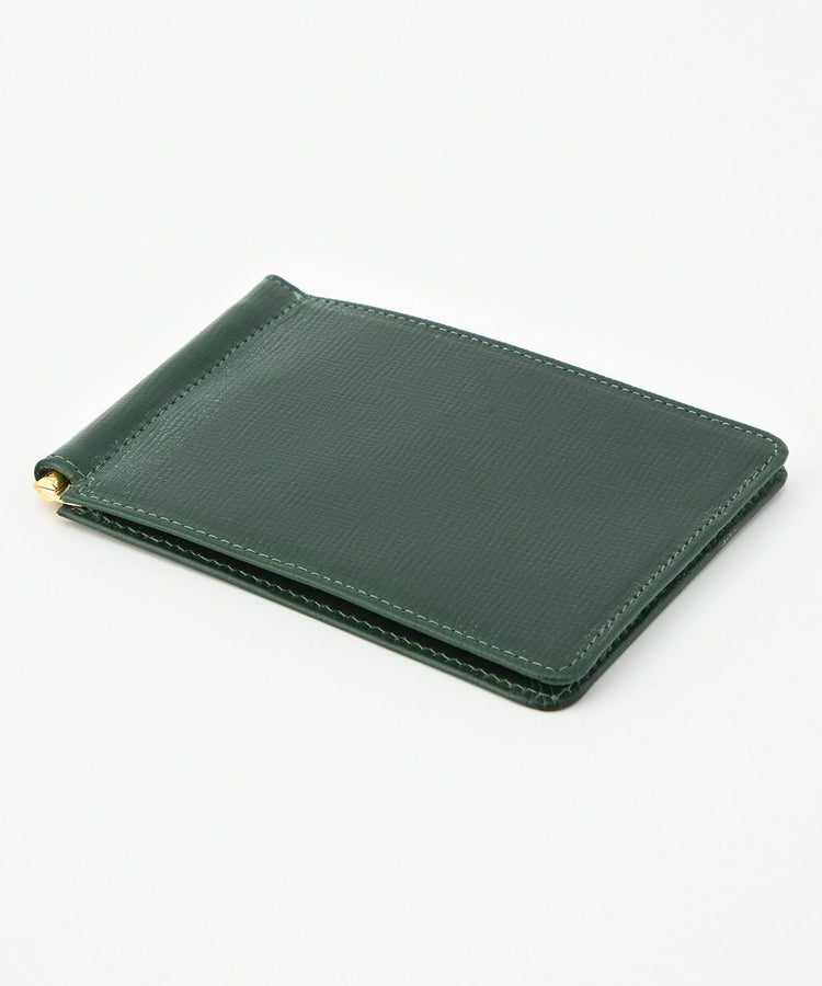 最も薄い財布でポケットなどに入れてもストレスフリー。シンプルな設計でありながら、お会計に必要な最低限の要素は完備。ゴールドのクリップは複数の紙幣をしっかり挟むことができ、なおかつ一枚だけを抜くのに丁度よい絶妙なホールド力。三角形にカットされたレザー部分は、お札を整え収める役割を果たします。