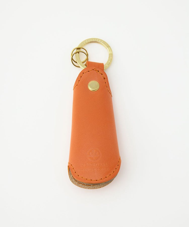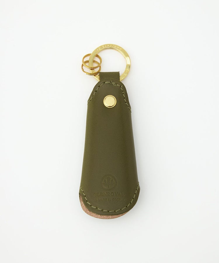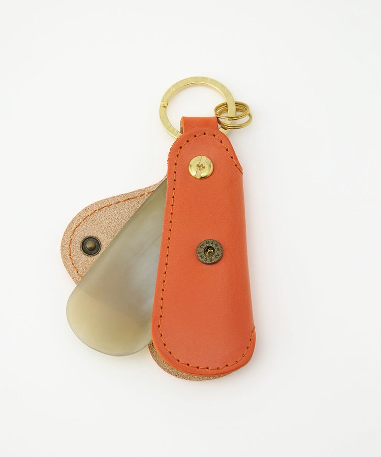 グレンロイヤルのポケットシューホーンは、何といっても手のひらに収まるコンパクトなサイズが魅力。どんな場所でも気軽に持ち歩く事が可能です。本体は水牛の角を採用しており、職人の手によってひとつひとつ丁寧に削って磨かれ、非常に滑らかな仕上がり。靴と踵の間にスルリと入り、靴を傷めることなくスムーズに履くことができます。シューホーンを覆うカバーは、グレンロイヤルのアイコンでもあるブライドルレザー。スナップボタンが付いているので、ホーンが飛び出てくる心配もありません。リングが付いておりキーホルダーとしても活用可能です。