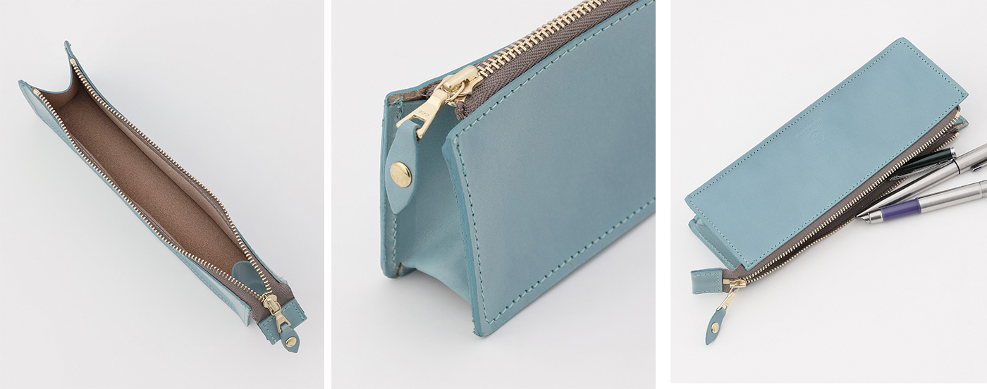 バッグの中でかさばらない丁度良い大きさで、開閉しやすいジップが付き、何よりポンと置いた際にしっかり自立してくれる使い勝手の良さが考えられた仕様。ブライドルレザーの滑らかで気持ちの良い質感も気分を高めてくれます。