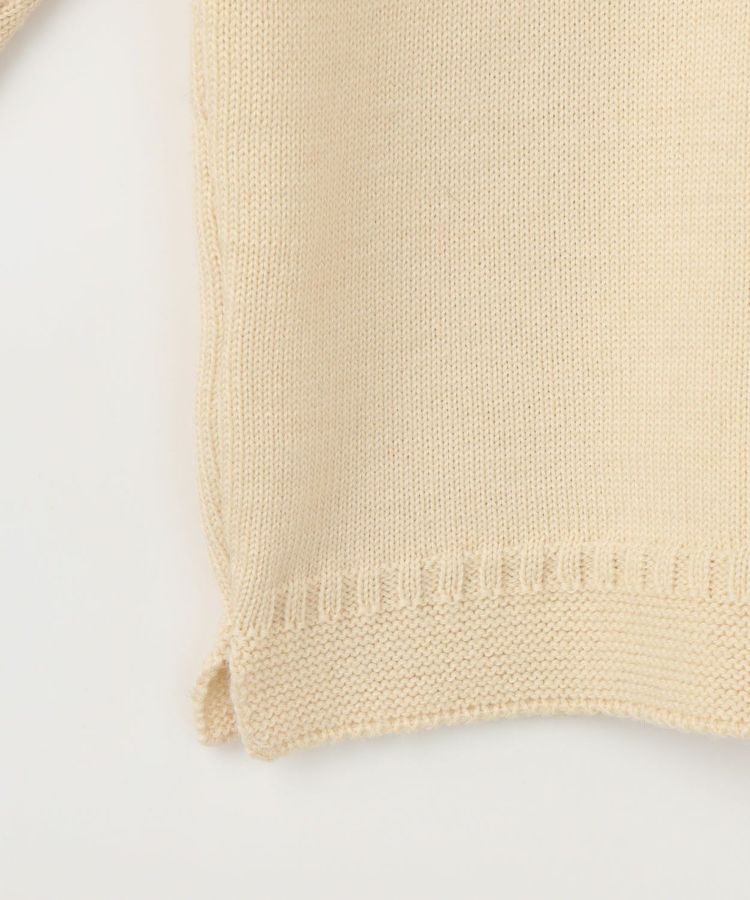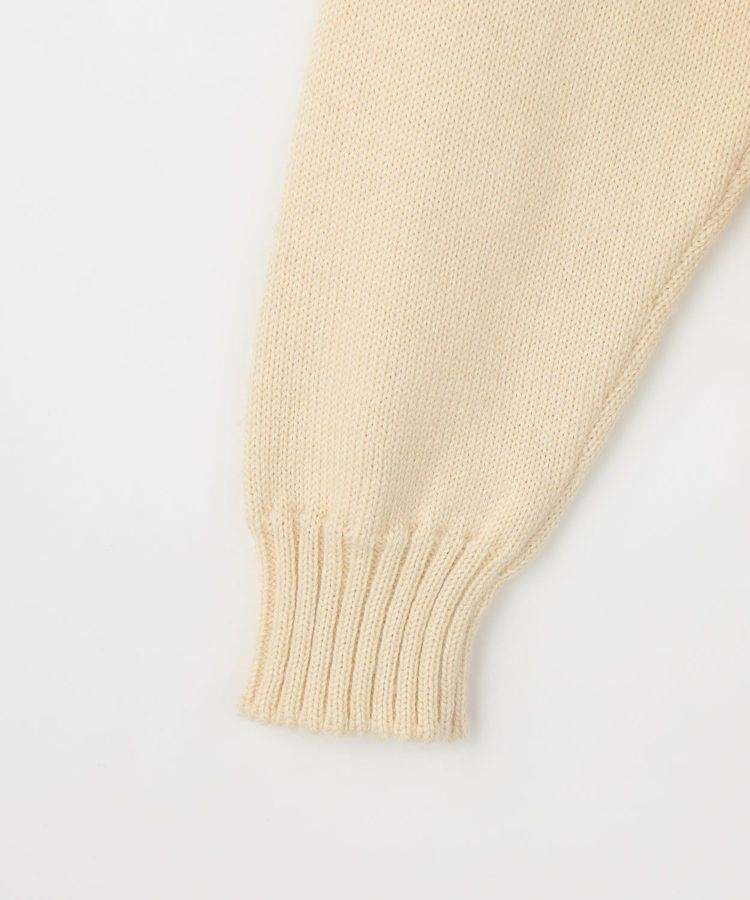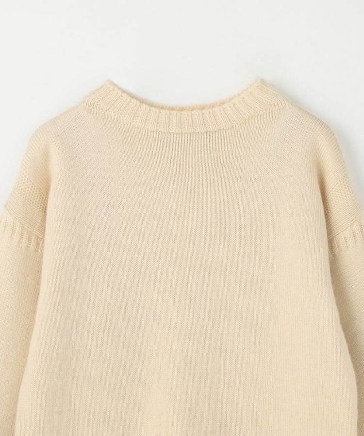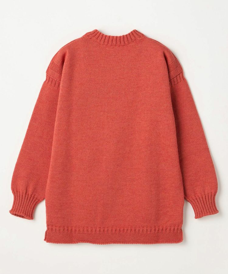 ウールで編まれたニットは肌触りがよく、漁師達が着ていただけあり、機能性と耐久性も備えています。アームホールや裾に編まれている独特の模様には、船のはしごやロープ、波などそれぞれ意味が込められています。また裾に取られたサイドスリットは運動量を上げるための仕様。襟ぐりの三角マチも同様に身体の動きを妨げない工夫がされています。袖リブと同じ、2目ゴム編みとガーター編みの二部構造は海で働く人たちのために工夫された背景のあるセーターです。