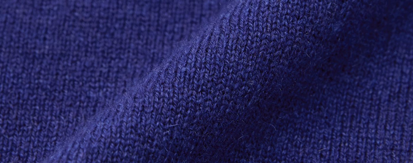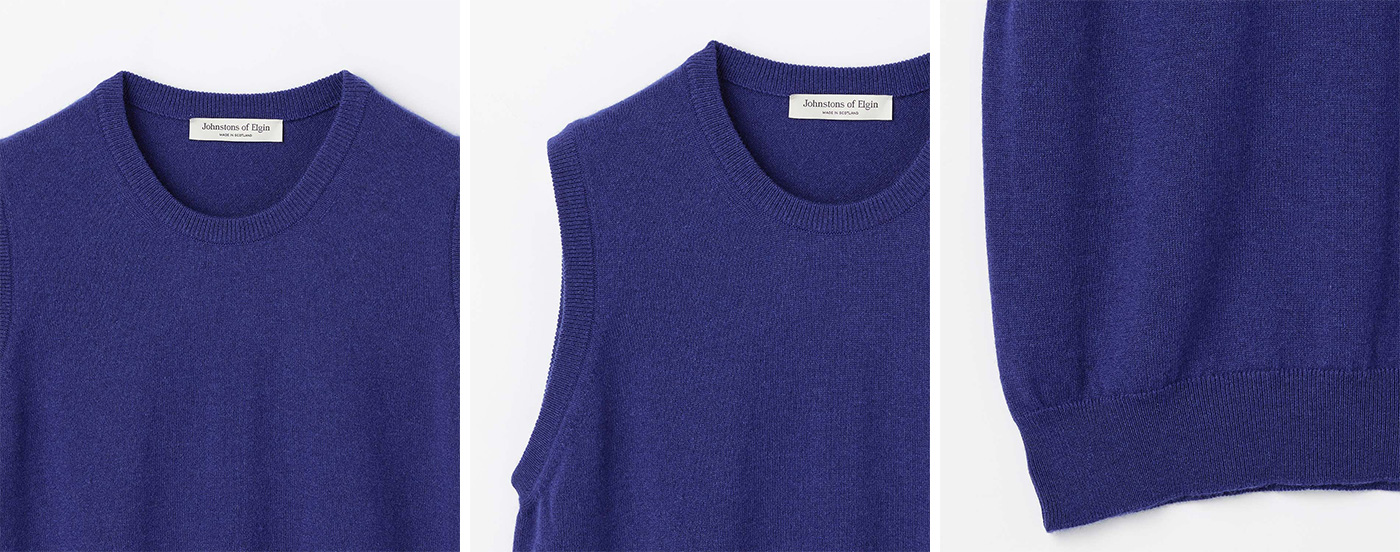 カシミヤ100%の2本撚り糸を用い、スコットランドの伝統的な風合いを再現した、しっかりとした編み地が魅力です。クルーネックや裾、アームホールには細めのリブ編みを施し、端正な印象に仕上げました。
