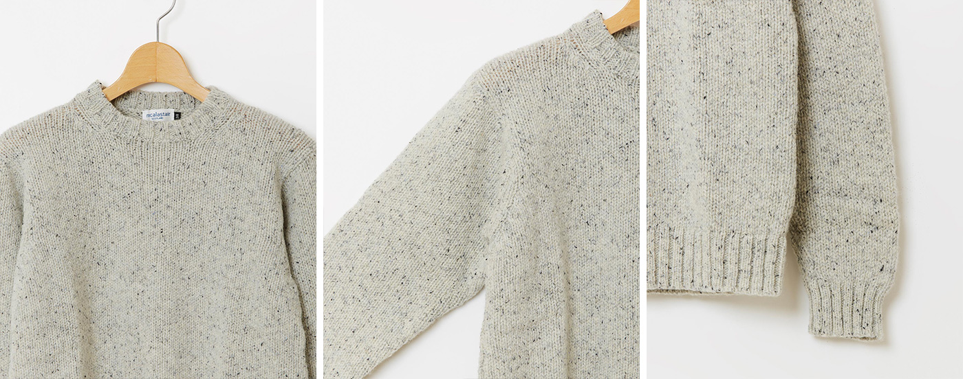 マカラスターでは、ブリティッシュウールの中でも特にスコットランド産のウールをメインに使用しています。厳しい寒さ、海から吹きすさぶ風、降り続く雨といった、決して穏やかではないスコットランドの環境を耐え忍んできた羊の毛には違いがあるといいます。 その毛質はしっかりしていて、型くずれしにくく、柔らかいながらも弾力性があり、雨を跳ね返す力が強い上に、吸湿性・放湿性にも優れ、肌着に使用されるくらい肌にやさしい繊維です。さらに製品によっては柔らかさを出すために、メリノウールやシルクをブレンドし、着心地のいい独特の風合いを追及しています。