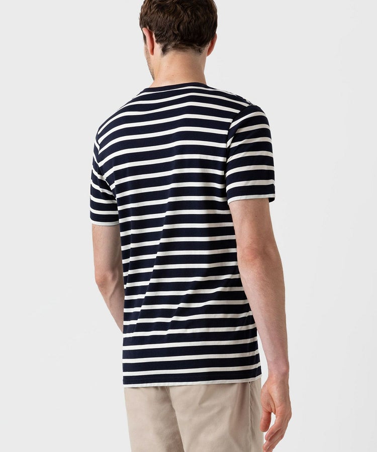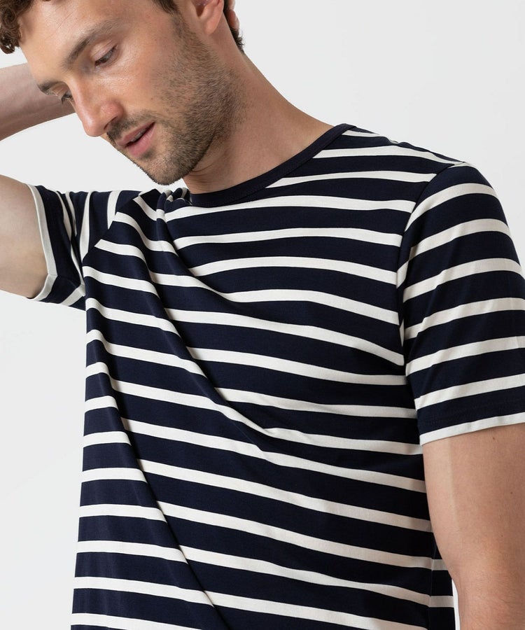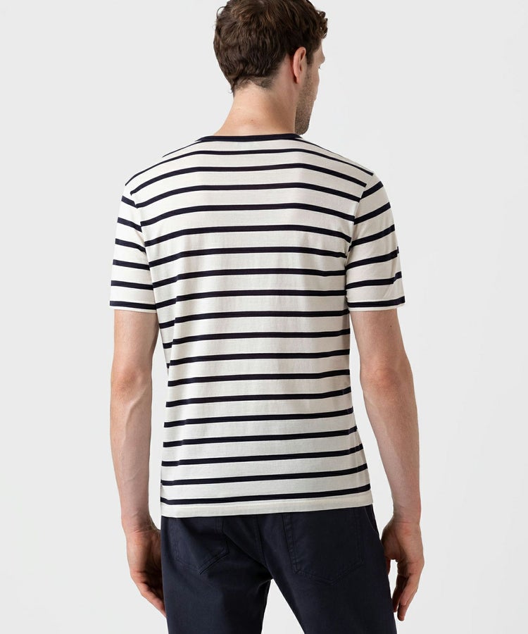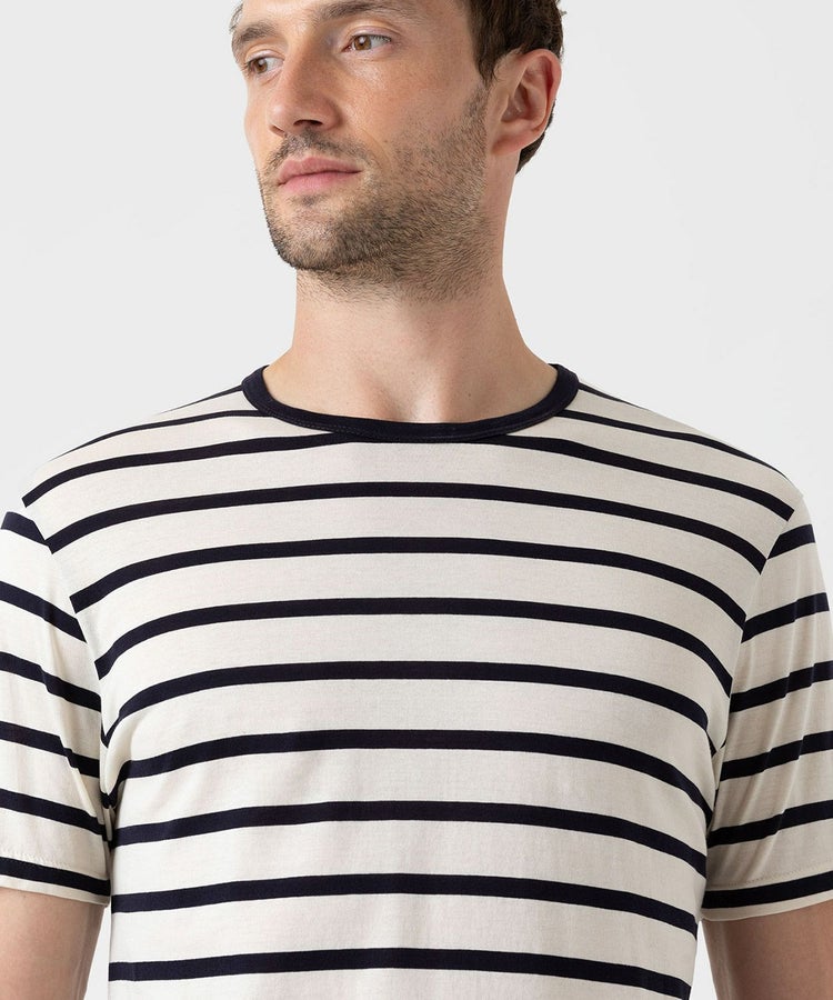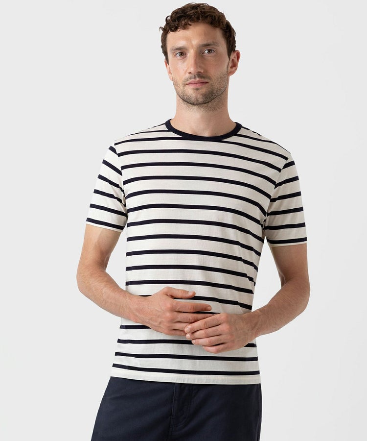 サンスペルが誇るスーピマコットンを二重構造にすることで、ソフトな肌触りと高い耐久性を兼ね備えています。ブルトンストライプと呼ばれるクラシカルなボーダーパターンは一枚で着てもレイヤードしても様になり、ワードローブにあると重宝するアイテムです。