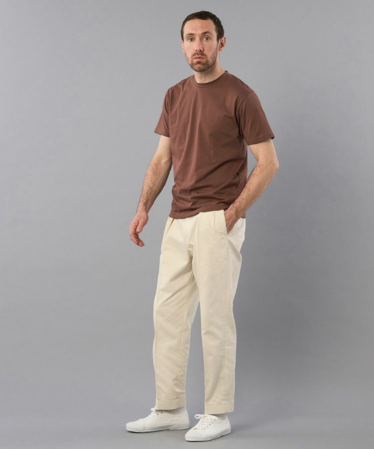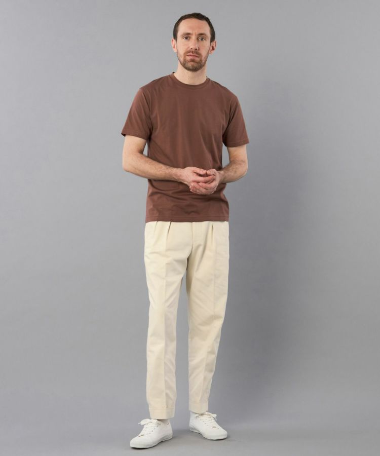 サンスペルが誇る良質なオーガニックコットンを贅沢に使用し、ソフトな肌触りと高い耐久性を実現しています。適度な厚みを残しているので、一枚で着ても、インナーとしてお気に入りのニットを重ねても様になり、ロングスパンでお楽しみいただけるアイテムです。