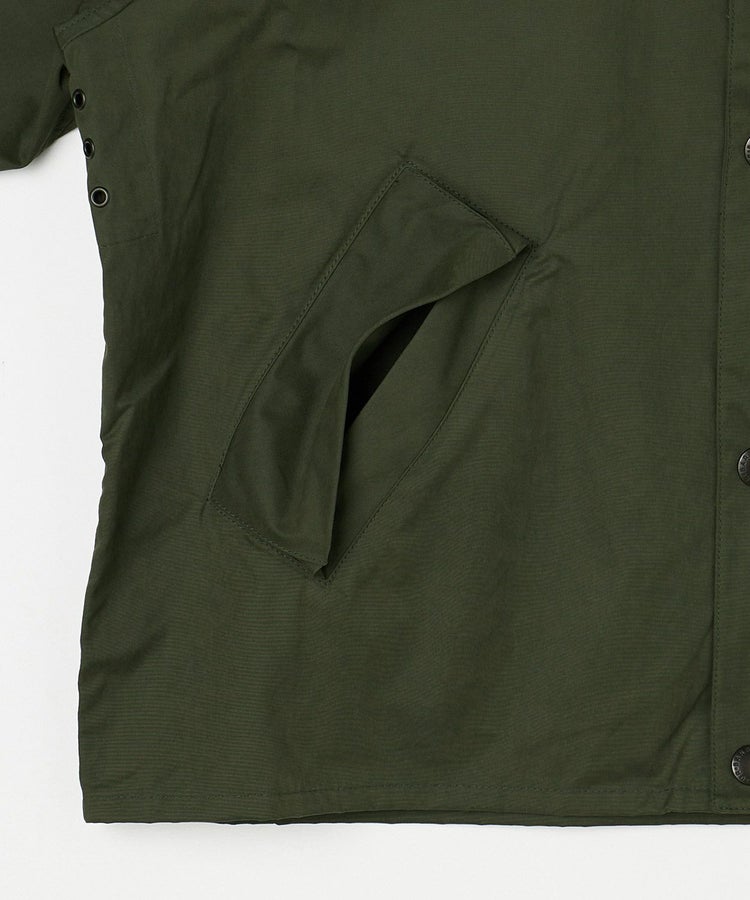 シルエット、ディティールはそのままにシーズンを問わず楽しめるよう、ノンワックスモデルです。定番のオイルドコットンに代わり、きめ細やかなポリエステル生地を起毛させ、短く刈り揃えたピーチスキンを採用しています。その名の通り、桃の皮の表面のような柔らかくて滑らかなタッチ感が特徴です。肌寒い3月頃まではチンストラップを留めて襟を立ててもよし、暖かい4、5月は羽織りものとしてレイヤードを楽しんでもよし。真夏・真冬を除いて通年で活躍します。コンパクトなレングスは、女性にも似合いやすく、ユニセックスで着用いただけるデザインも魅力です。