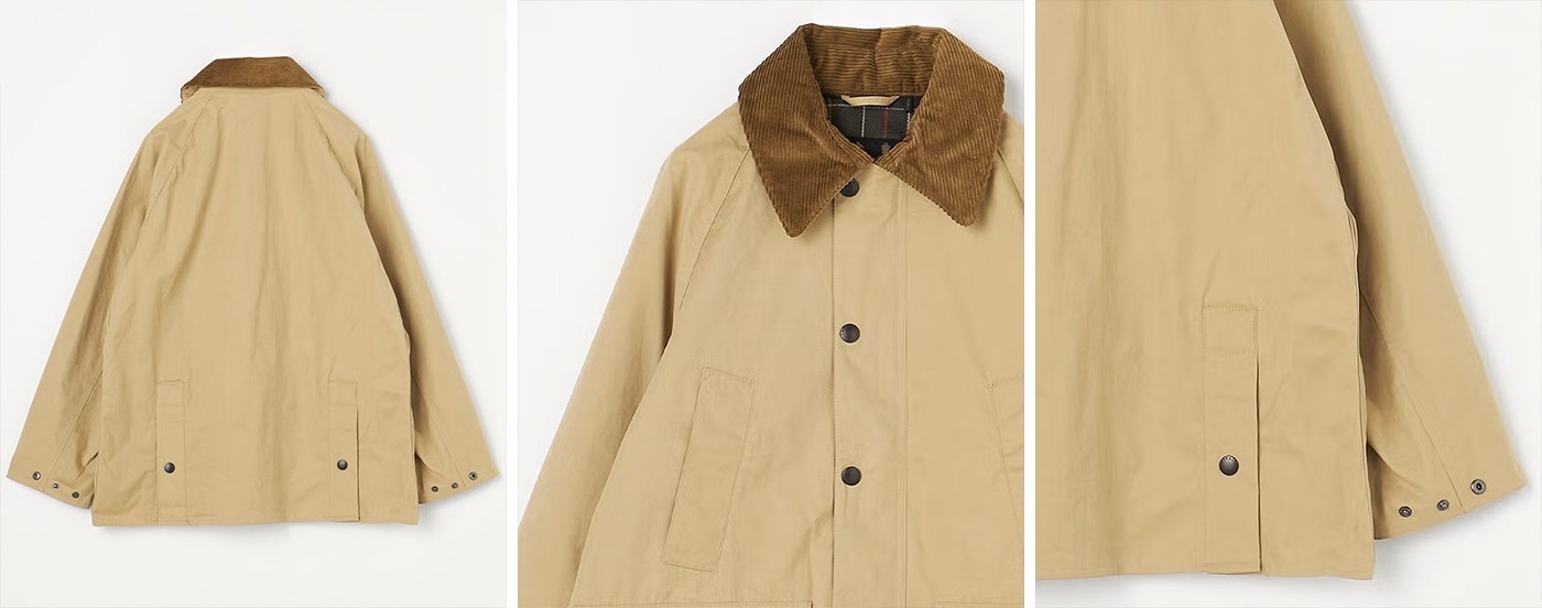 その名の通り、桃のように微起毛でしっとりとした滑らかな肌触りと軽やかな質感が特徴。もともと乗馬用ジャケットとして生み出され、ジョッキーたちのアドバイスを反映し、馬に乗った際に裾が突っ張ることなくきれいに着られるよう、サイドベンツ仕様になっています。また、ライディングポーズを優雅に保つため、丈が長めの作りです。こうした誕生背景を感じさせるデザインを楽しみつつ、ノンワックスならではの軽やかな着心地とクラシックモデルよりもややゆったりとしたシルエットも魅力。シーズンを問わず活躍できる一枚です。