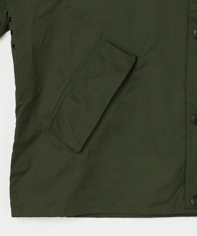 シルエット、ディティールはそのままにシーズンを問わず楽しめるよう、ノンワックスモデルです。定番のオイルドコットンに代わり、きめ細やかなポリエステル生地を起毛させ、短く刈り揃えたピーチスキンを採用しています。その名の通り、桃の皮の表面のような柔らかくて滑らかなタッチ感が特徴です。肌寒い3月頃まではチンストラップを留めて襟を立ててもよし、暖かい4、5月は羽織りものとしてレイヤードを楽しんでもよし。真夏・真冬を除いて通年で活躍します。コンパクトなレングスは、女性にも似合いやすく、ユニセックスで着用いただけるデザインも魅力です。