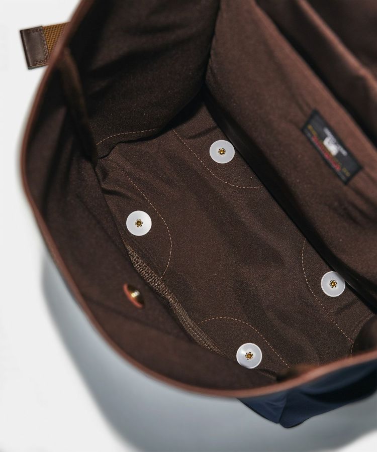 レザー部分には贅沢にブライドルレザーを使用。フロントのフラップベルトはギボシ仕様にすることで開閉しやすく、収納量によって調整が可能です。ショルダーストラップは長さ調整ができ、両サイドのポケットにはスマートフォンや水筒などを収納できます。内側には背面の壁に沿うようにポケットが設けられ、細部にまでこだわりが詰まったアイテムに仕上がっています。