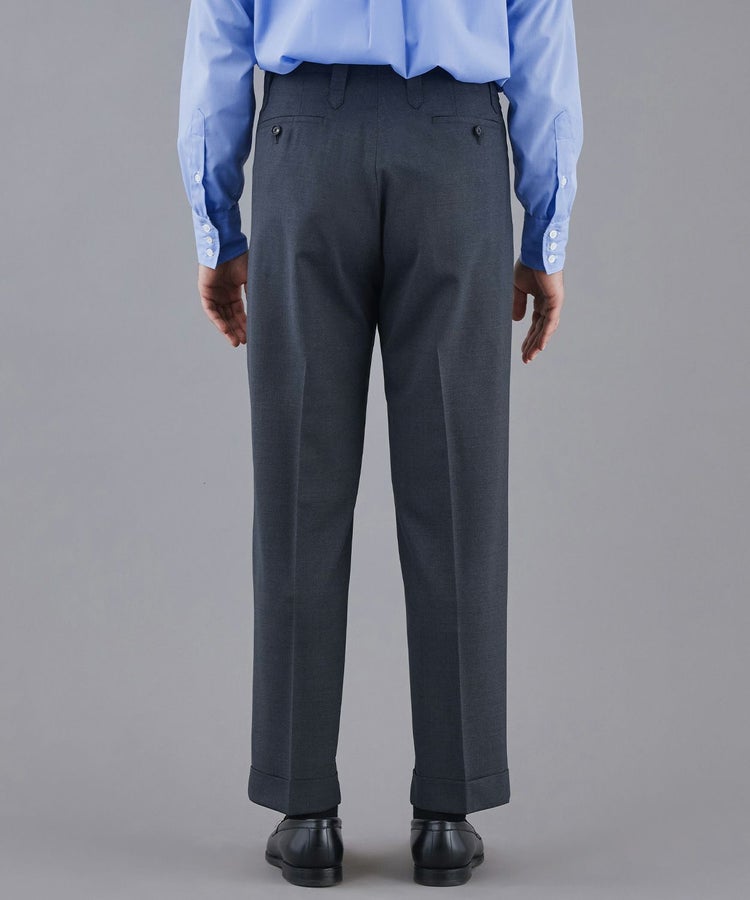 パンツの原型はイギリス軍の「No.2 DRESS PANTS」ですが、原型を踏襲しつつ、特徴的なベルトループのデザインや太さなどを調整していき、原型よりも上品で大人が穿ける顔つきに仕上げています。実用性も考慮して6本ベルトループを付けました。