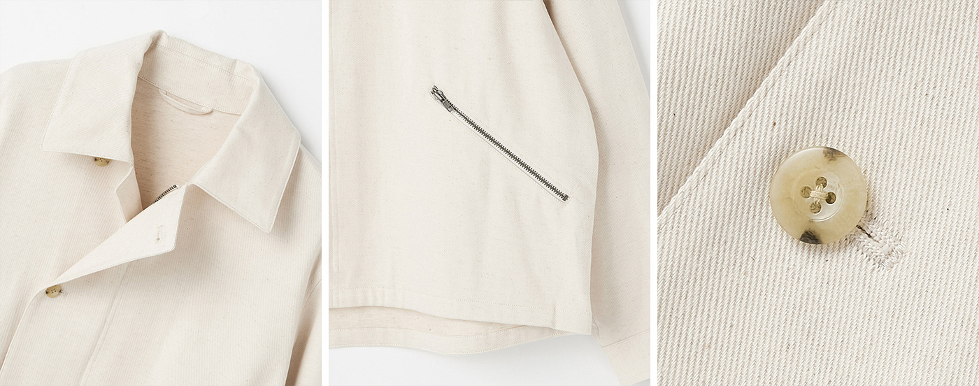 ハの字スラッシュジップポケットは、アクセスしやすい位置に変更するなど、実用性も高めています。さらに芯地の厚さやステッチの位置、運針といった細かい部分までこだわり、カジュアルなライトアウターという側面を持ちつつも上品な香りがするアイテムに仕上がっています。