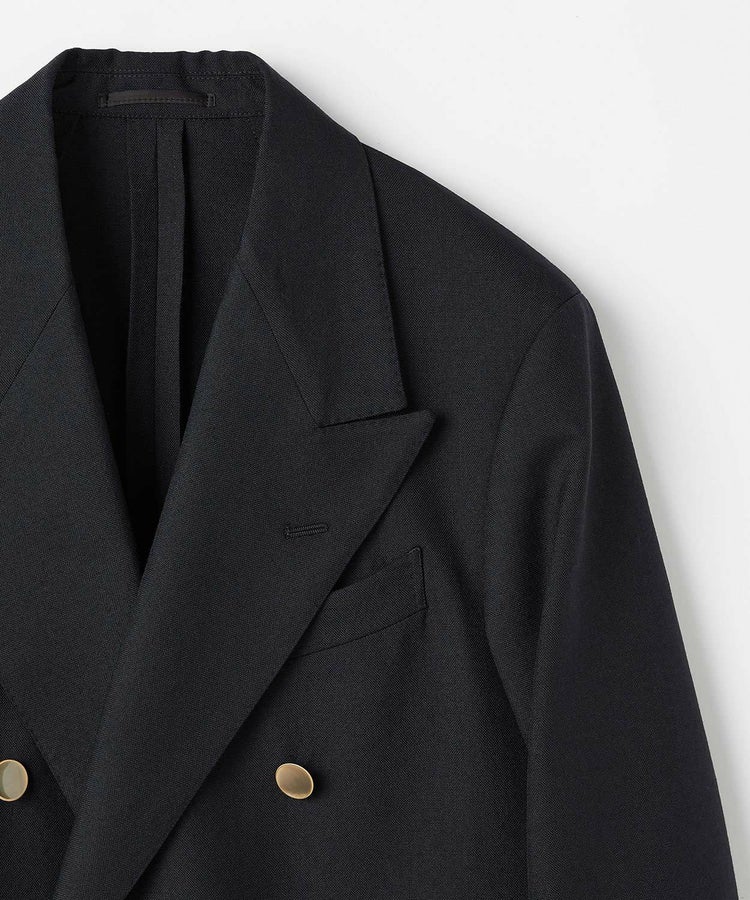 ラペル幅11cmと迫力のある太さながらも、クラッシックになりすぎずモダンな表情にしています。やや低いゴージ、主張しすぎない角度の剣先ライン、シャープな印象を与えるラペルロールが特徴です。