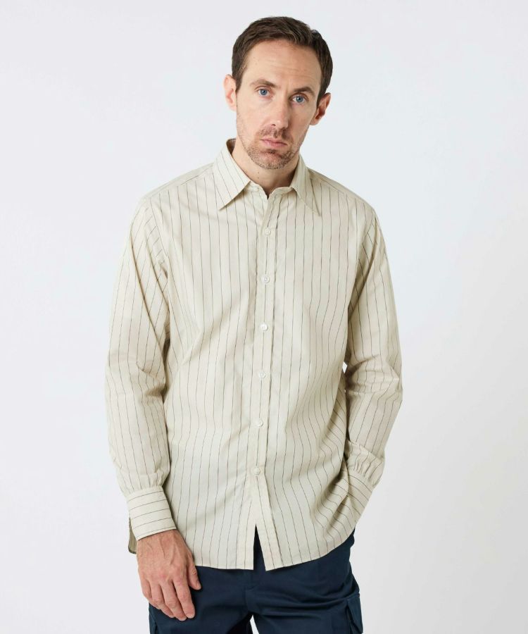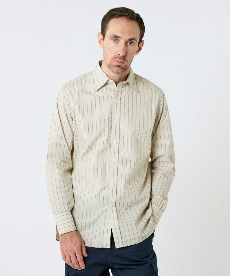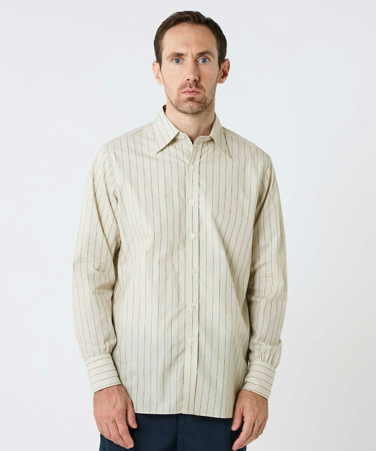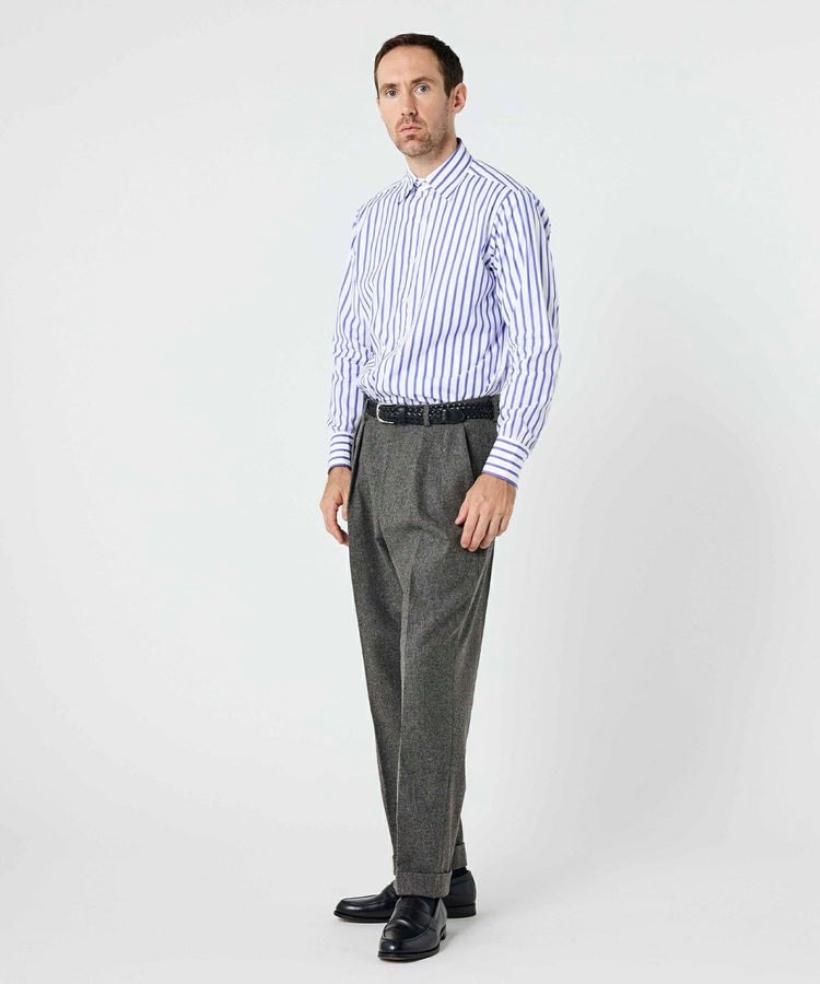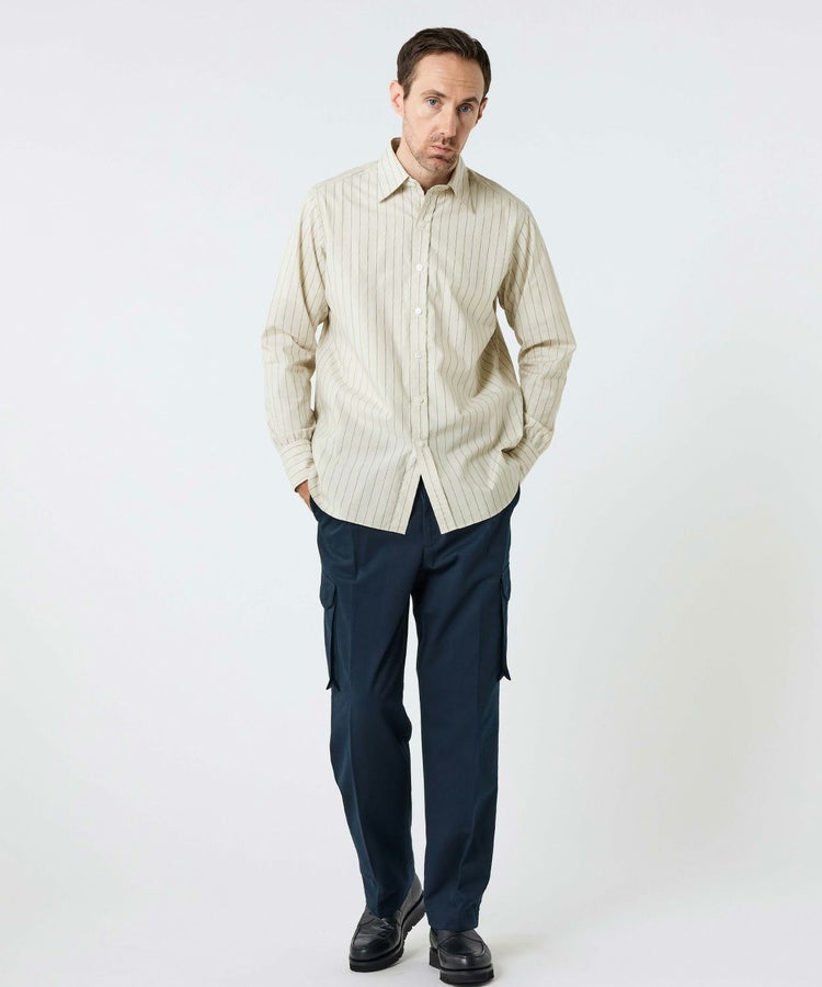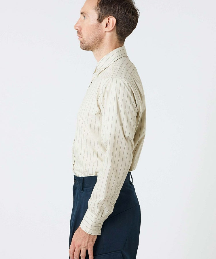 スタイリスト目線で考えた時代性と着回しやすさ、そして一人の服好きとしてシンプルに思った“こんなシャツが着たい!”という理想を形にしました。ビスポークスーツ、ラグジュアリーメゾン、カジュアルウェアと、スタイリストの中でも随一の守備範囲で活躍する四方章敬氏が手がけたシャツだけに、ブリティッシュメイドとしても120%の自信をもっておすすめしたい完成度です。