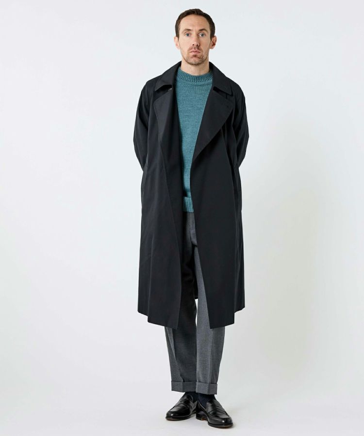 コートを“着込む”というよりも、軽やかに“羽織る”イメージで、作りやディテールを現代のライフスタイルに合うようアップデート。中でもこだわったポイントは、足さばきに影響が出ない範囲で考えられた長めの着丈。またドレープがキレイに出る生地の特性を活かし、インバーテッドバックプリーツを深くし、ベルトを結んだ時キレイに「X」ラインが出るよう考えられたデザインとシルエット。結んだ際バランス調整ができるようベルトは長めの仕様になっております。