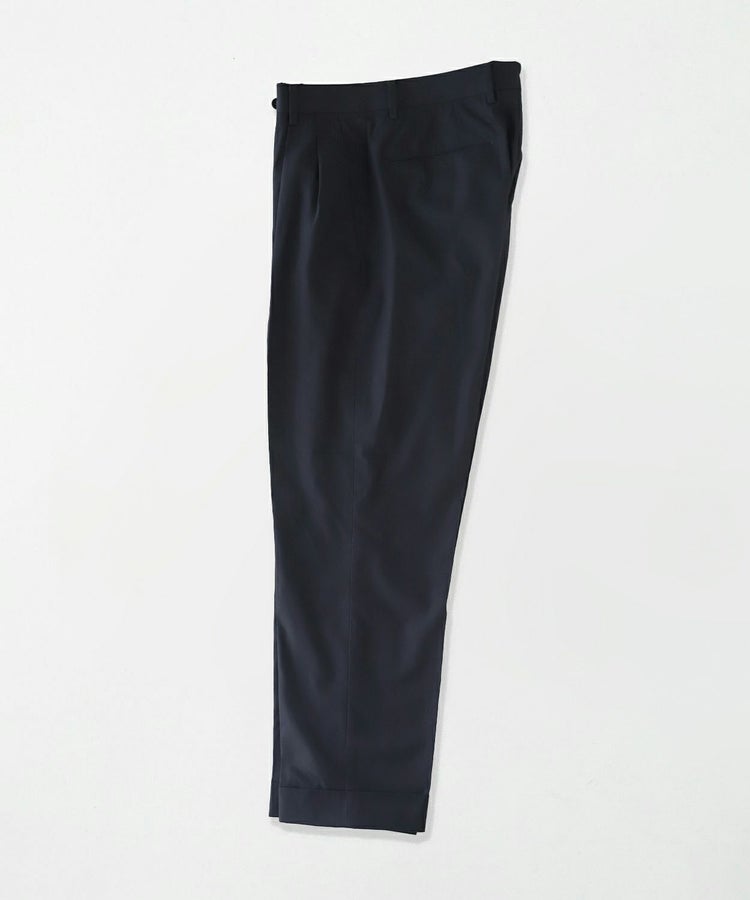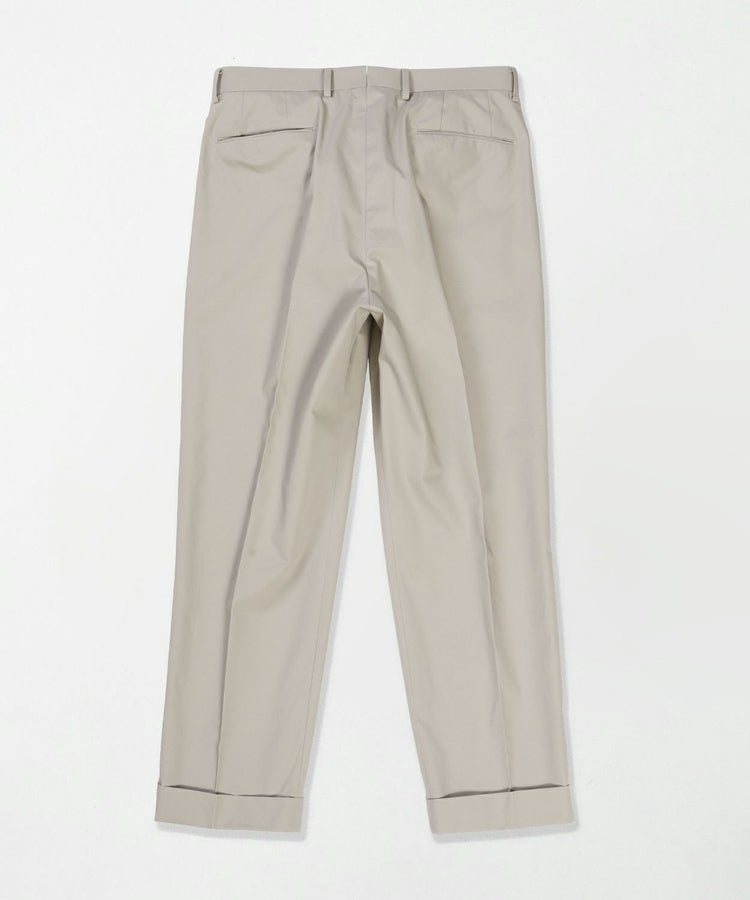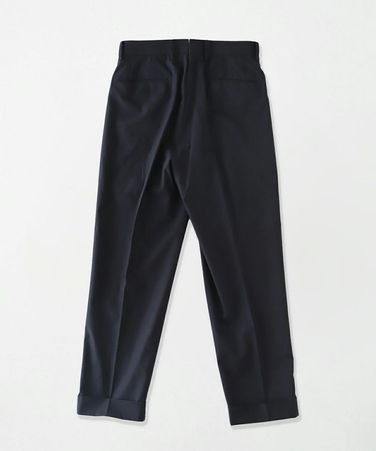 イメージソースとしたのはロイヤルネイビー(英国海軍)のホワイトドリルトラウザー。本来のシルエットよりも膝と裾巾を細くしテーパード感をやや強めたオリジナルバランス。パターンに振り込みを入れて、真っ直ぐ立った時に、キレイにストンと落ちるよう工夫を入れ立ち姿の美しいシルエットにも拘りました。ヒップサイドの脇線は真っ直ぐではなくカーブを強くし、もたつかないようフィットするデザインに。マーベルト(※)仕様のためシャツをタックインした際にズリ上がり難くなっております。オンオフがシームレス化する今のライフスタイルに最適なパンツです。
