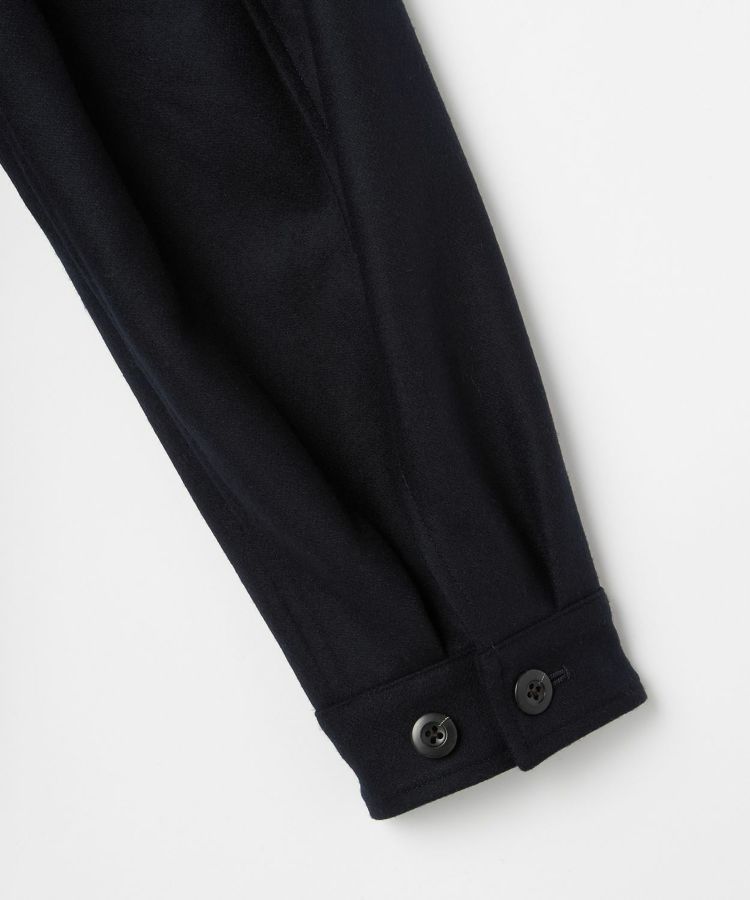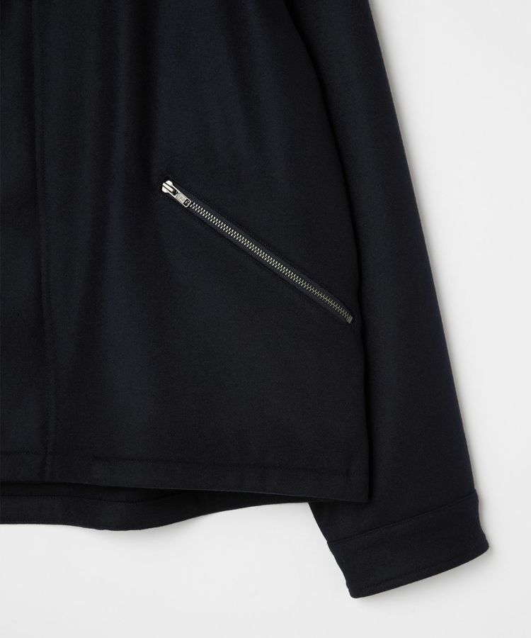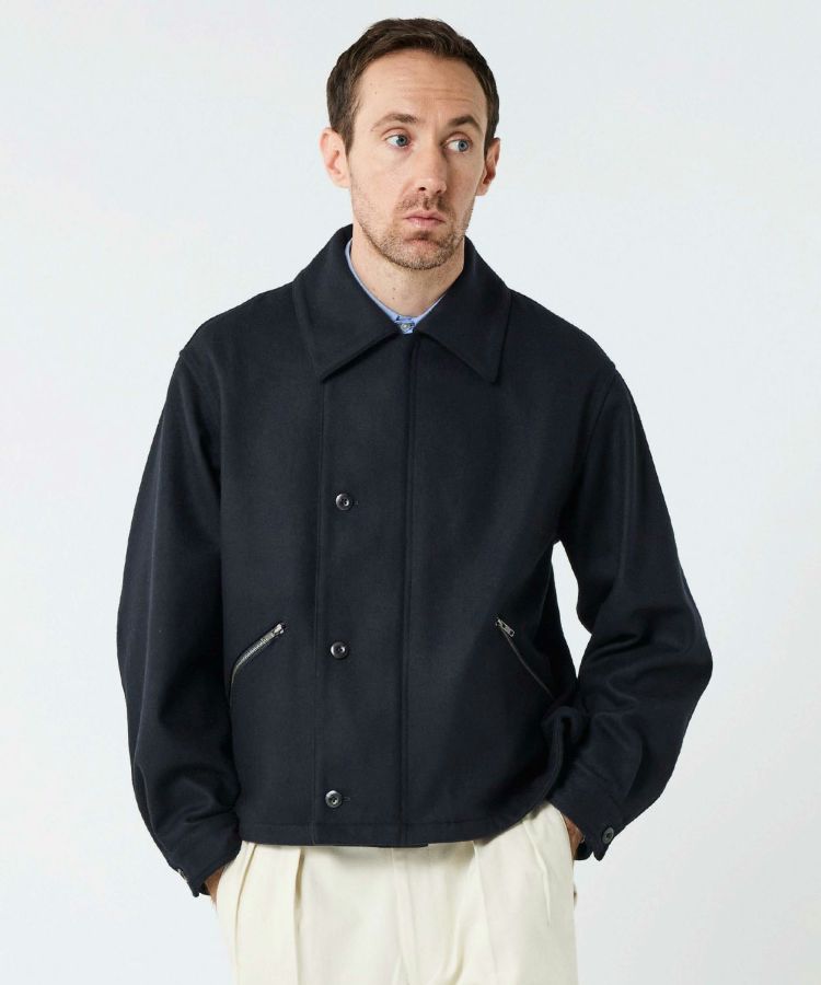 ゆったりとした身幅と短めの着丈が程よく今っぽい雰囲気になっています。また、大きめの襟とボタン位置が中心から少しずれるアシンメトリーなデザインといった特徴的なディティールは活かしつつも、現代の生活で不必要なディティールはそぎ落とし、ミニマルな印象で日常で大人が着られるフライトジャケットに昇華。ハの字スラッシュジップポケットは、アクセスしやすい位置に変更するなど、実用性も高めています。さらに芯地の厚さやステッチの位置、運針といった細かい部分までこだわり、カジュアルなライトアウターという側面を持ちつつも上品な香りがするアイテムに仕上がっています。
