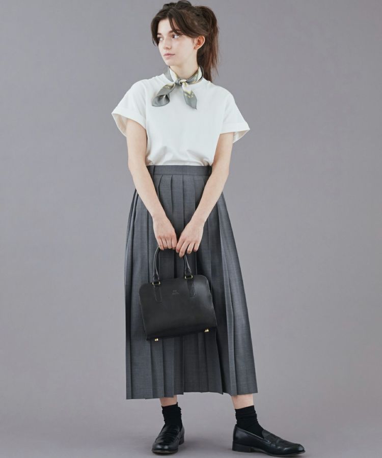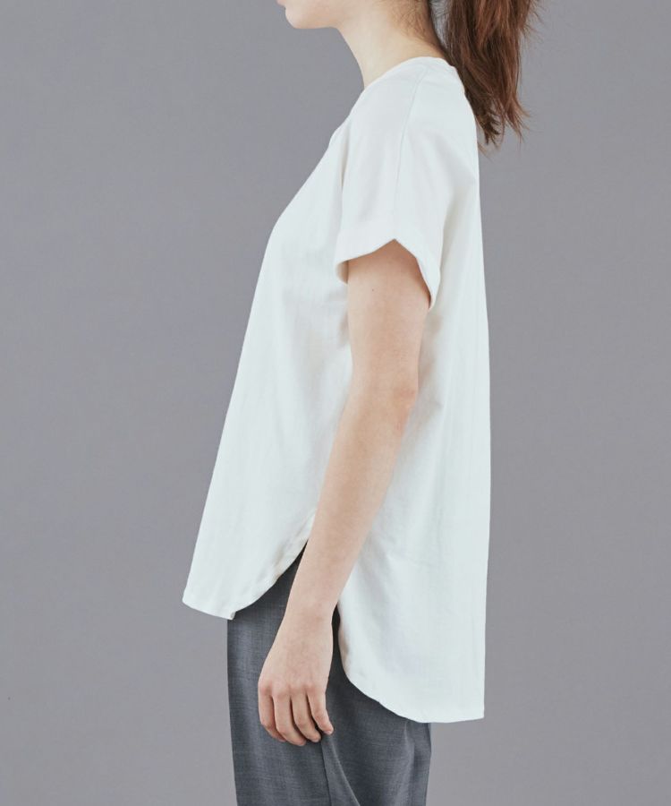 袖口の折り返しと後ろのタックデザインが効いており、一枚でコーディネートがまとまります。春夏はもちろん、インナーとしてレイヤードにも活躍してくれるので一年中使える万能アイテムです。タックインしやすいように、裾はラウンドでサイドにスリットが入っており、ボトムスとも相性がよく、フロントのみタックインしたり、タックアウトしてパンツやスカートに合わせることができます。シンプルながら、ディティールにこだわったデザインと、シルエットが魅力なTシャツは、ジャケットの下やカジュアルスタイルまで幅広く対応が出来ます。フレンチスリーブのような袖口は、さりげなく二の腕をカバーしてくれます。生地は適度な厚みがありながらも柔らかく、着心地の良いコットン100%素材です。
